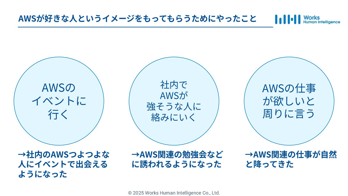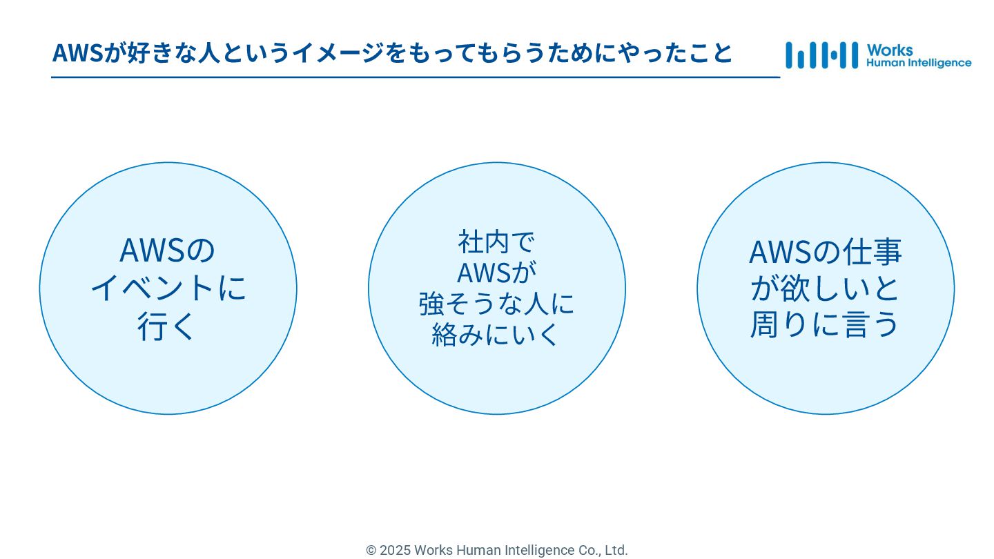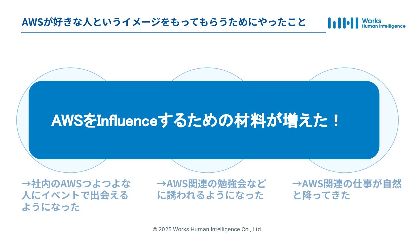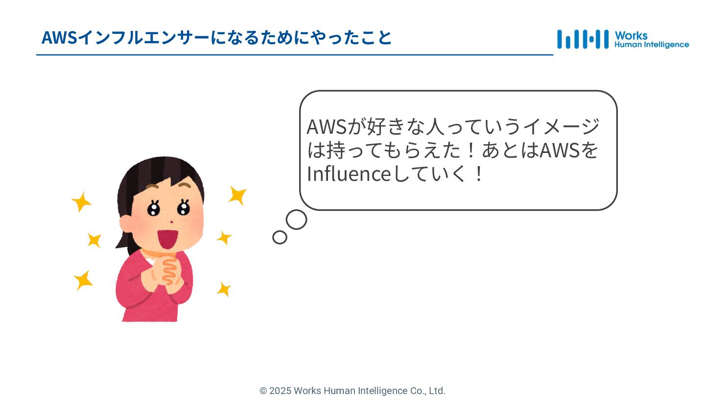 © 2025 Works Human Intelligence Co., Ltd. AWSが好きな⼈っていうイメージ は持ってもらえた!あとはAWSを Influenceしていく!