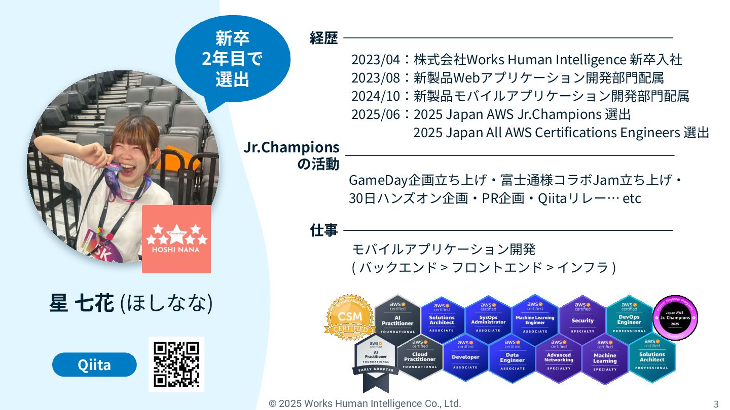 (ほしなな) 経歴 仕事 2023/04:株式会社Works Human Intelligence 新卒⼊社 2023/08:新製品Webアプリケーション開発部⾨配属 2024/10:新製品モバイルアプリケーション開発部⾨配属 2025/06:2025 Japan AWS Jr.Champions 選出 2025 Japan All AWS Certifications Engineers 選出 Qiita GameDay企画⽴ち上げ‧富⼠通様コラボJam⽴ち上げ‧ 30⽇ハンズオン企画‧PR企画‧Qiitaリレー… etc 2 Jr.Champions の活動 モバイルアプリケーション開発 ( バックエンド > フロントエンド > インフラ ) 新卒 3年⽬