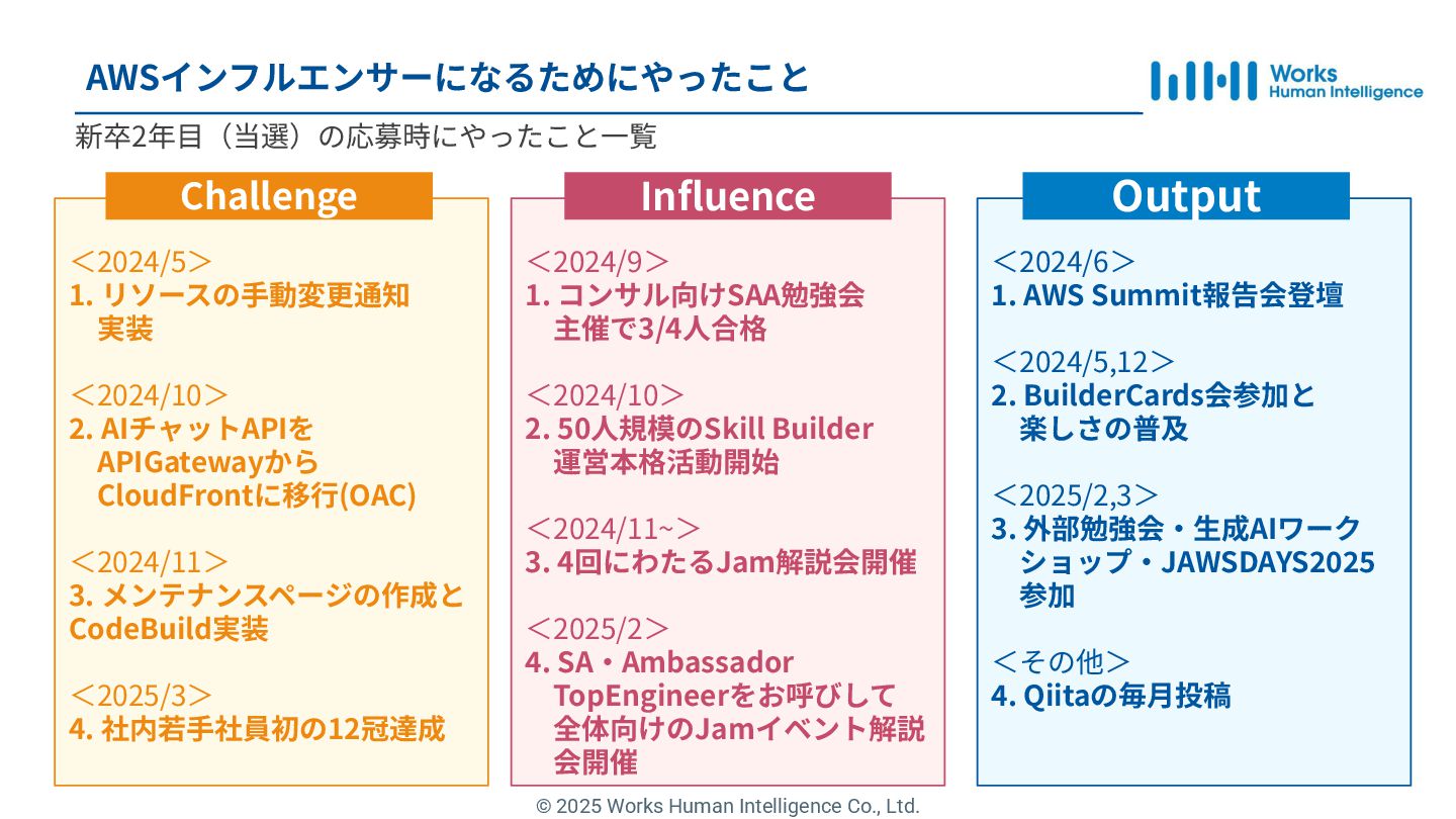 AWS Summit報告会登壇 <2024/5,12> 2. BuilderCards会参加と 楽しさの普及 <2025/2,3> 3. 外部勉強会‧⽣成AIワーク ショップ‧JAWSDAYS2025 参加 <その他> 4. Qiitaの毎⽉投稿 <2024/9> 1. コンサル向けSAA勉強会 主催で3/4⼈合格 <2024/10> 2. 50⼈規模のSkill Builder 運営本格活動開始 <2024/11~> 3. 4回にわたるJam解説会開催 <2025/2> 4. SA‧Ambassador TopEngineerをお呼びして 全体向けのJamイベント解説 会開催 <2024/5> 1. リソースの⼿動変更通知 実装 <2024/10> 2. AIチャットAPIを APIGatewayから CloudFrontに移⾏(OAC) <2024/11> 3. メンテナンスページの作成と CodeBuild実装 <2025/3> 4. 社内若⼿社員初の12冠達成 Challenge Influence Output 新卒2年⽬(当選)の応募時にやったこと⼀覧 Influenceに⼒を⼊れた結果、 ChallengeもOutputも伸びてきた!