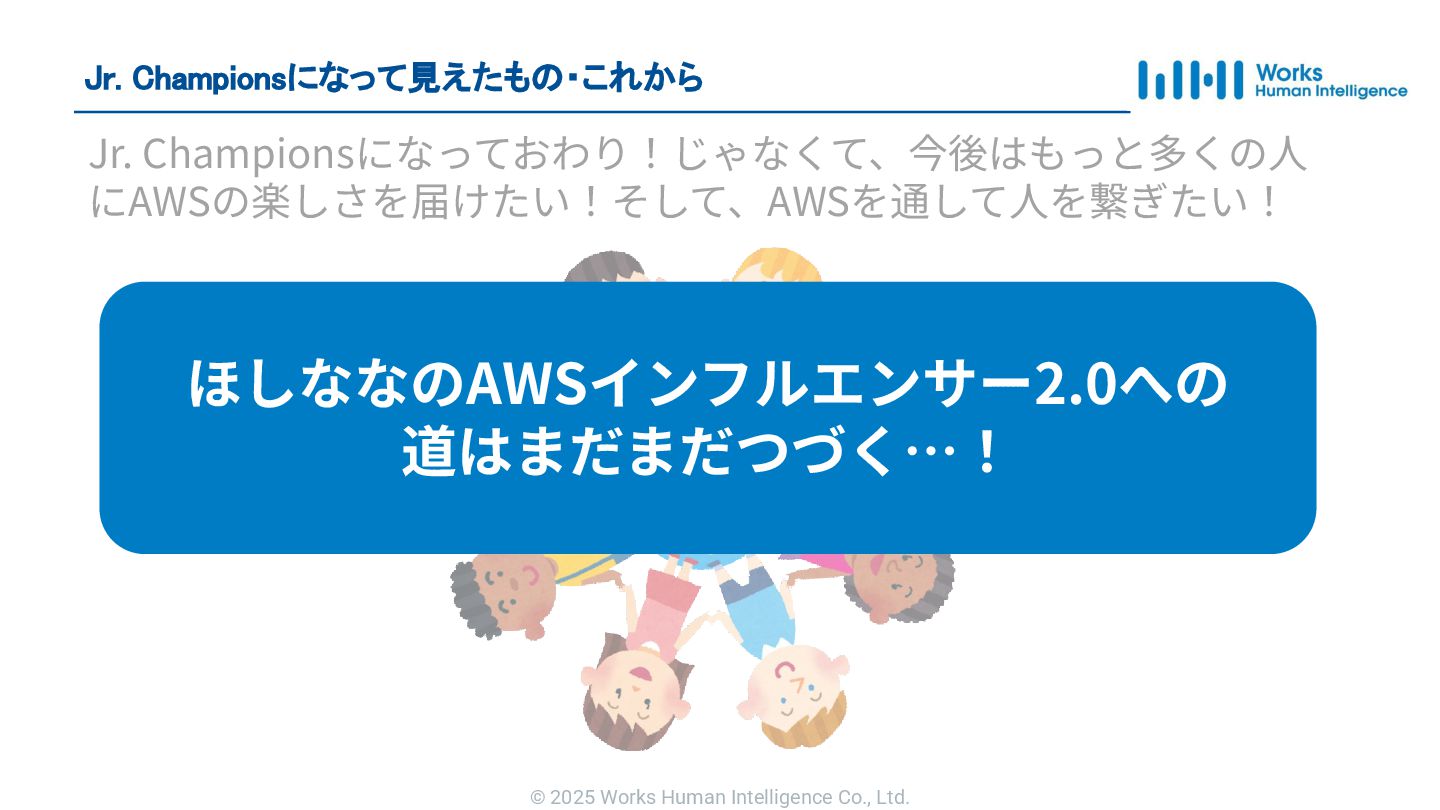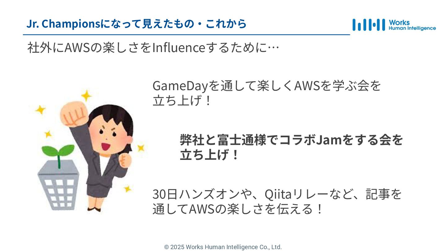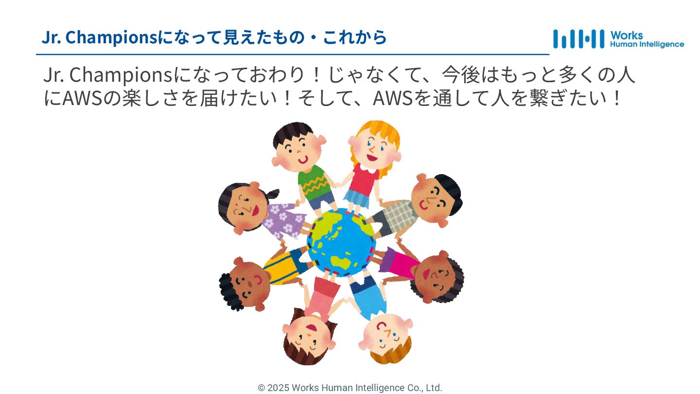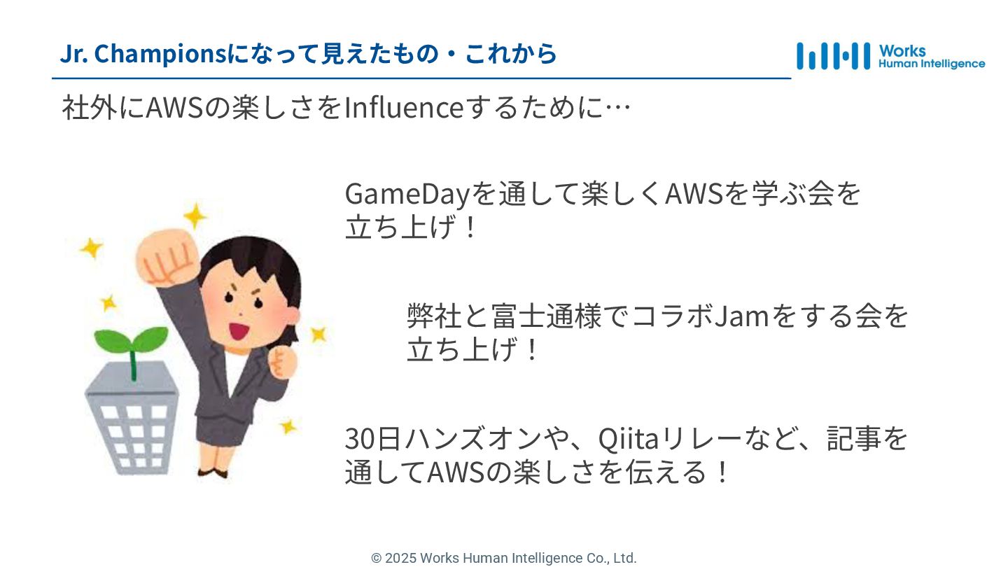 © 2025 Works Human Intelligence Co., Ltd. 社外にAWSの楽しさをInfluenceするために… Jr. Championsになって⾒えたもの‧これから
