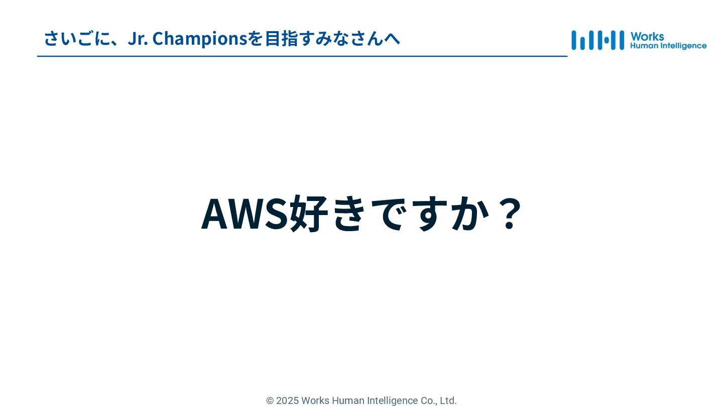 © 2025 Works Human Intelligence Co., Ltd. さいごに、Jr. Championsを⽬指すみなさんへ AWS好きですか?