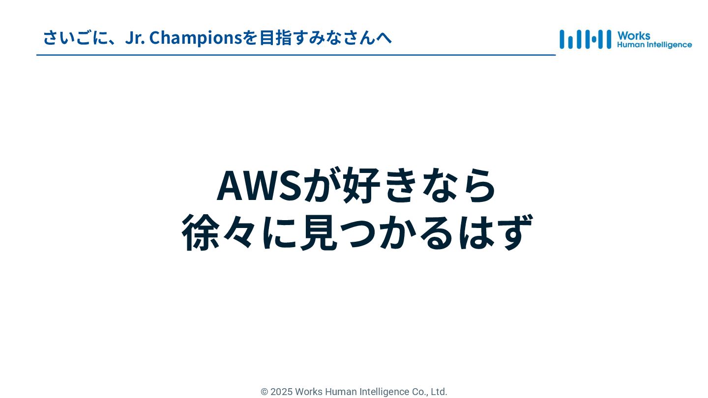 © 2025 Works Human Intelligence Co., Ltd. さいごに、Jr. Championsを⽬指すみなさんへ AWSが好きなら