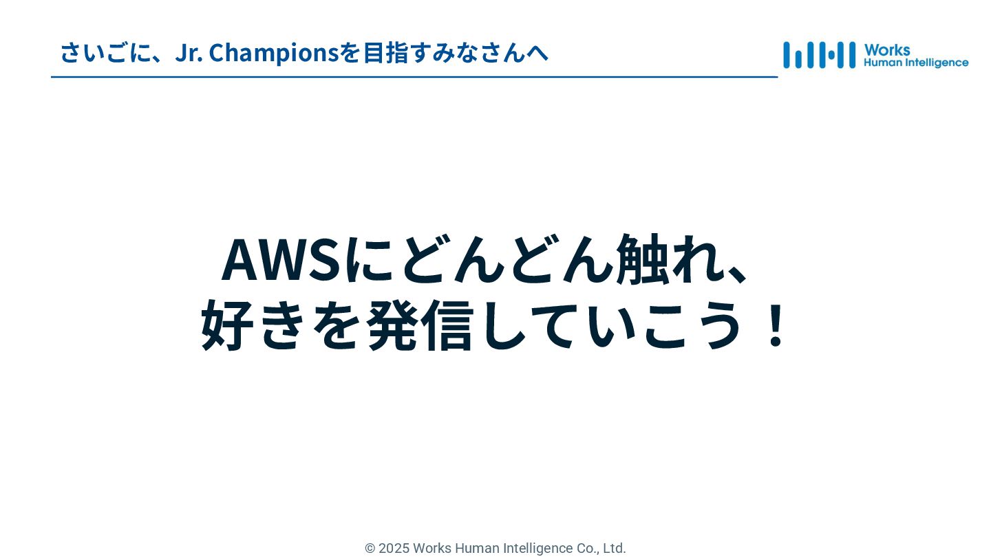 © 2025 Works Human Intelligence Co., Ltd. さいごに、Jr. Championsを⽬指すみなさんへ AWSにどんどん触れ、