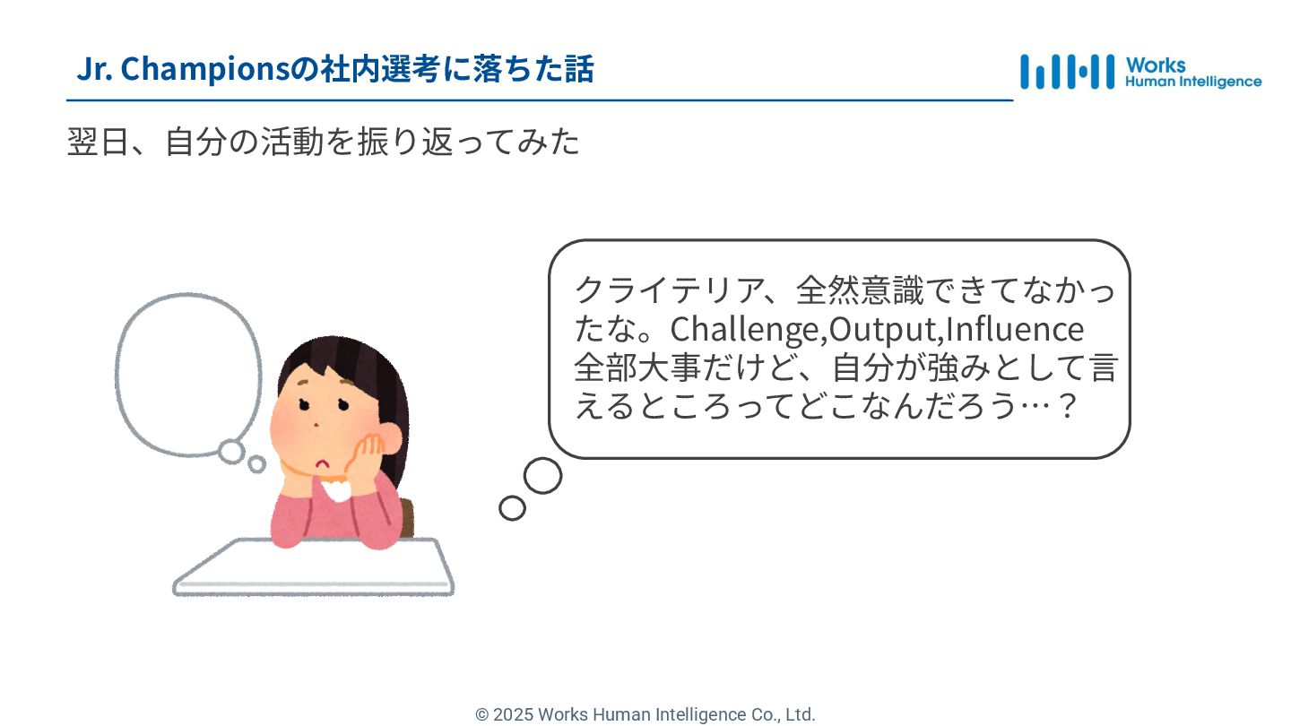 © 2025 Works Human Intelligence Co., Ltd. Jr. Championsの社内選考に落ちた話 クライテリア、全然意識できてなかっ