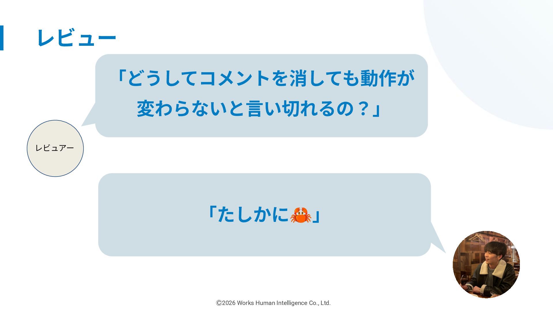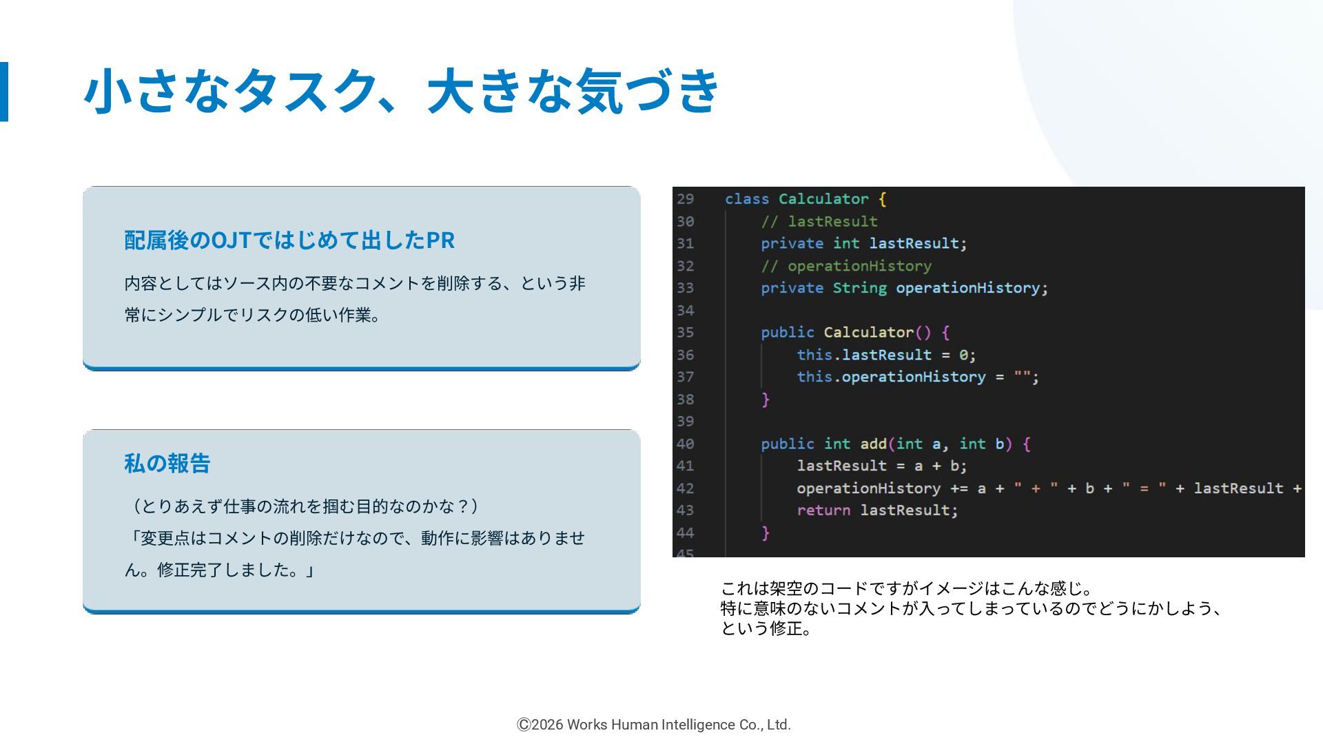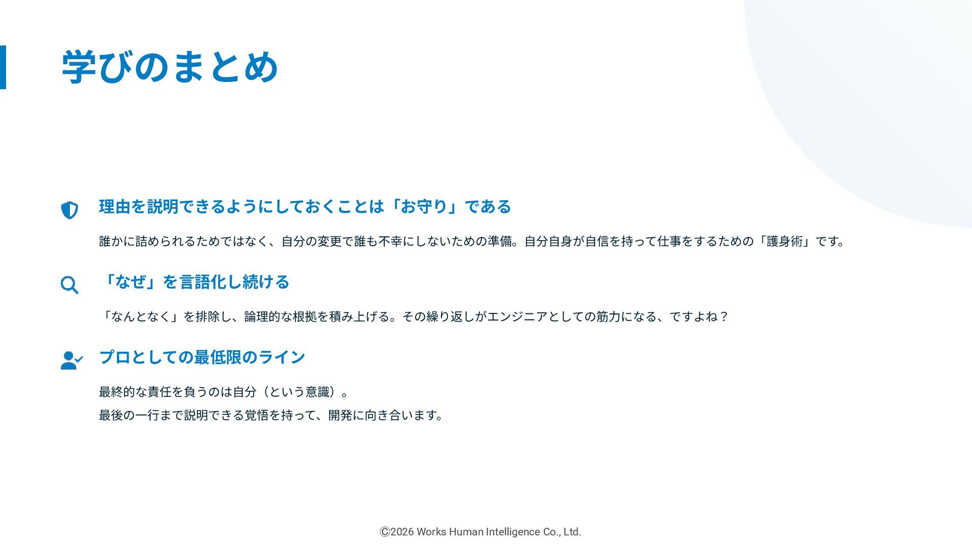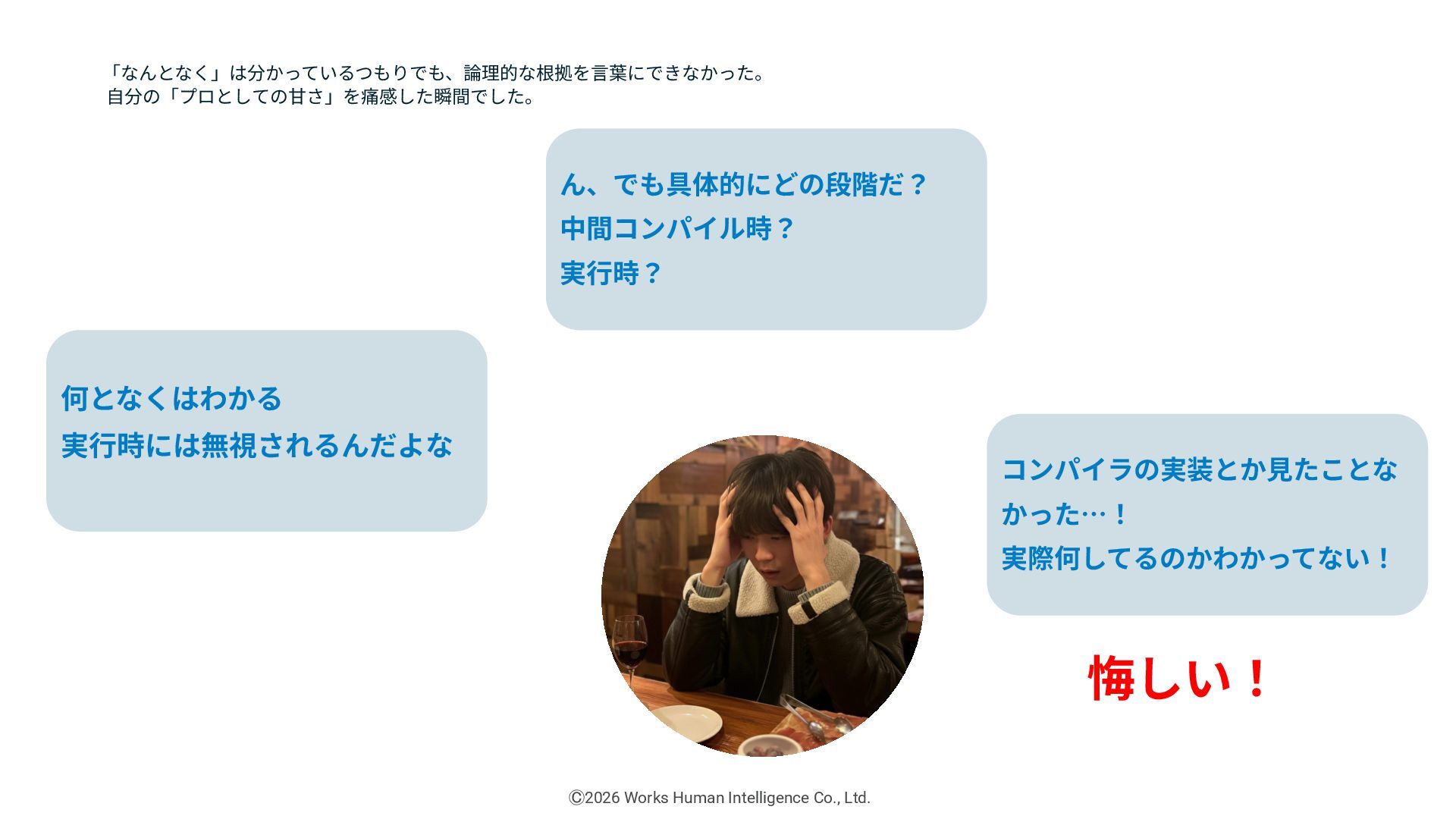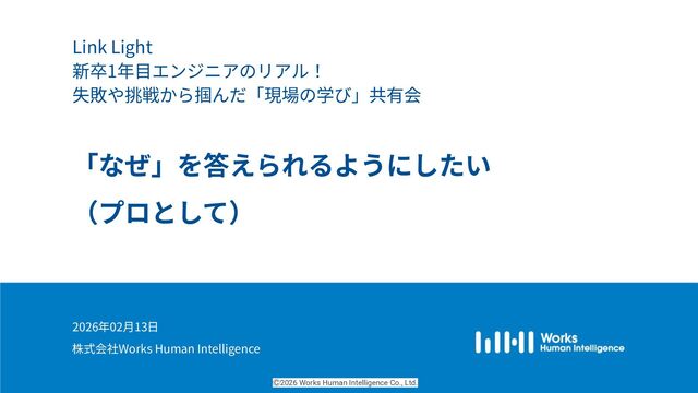 新卒1年⽬エンジニアのリアル! 失敗や挑戦から掴んだ「現場の学び」共有会 「なぜ」を答えられるようにしたい (プロとして) 株式会社Works Human Intelligence Ⓒ2026 Works Human Intelligence Co., Ltd.