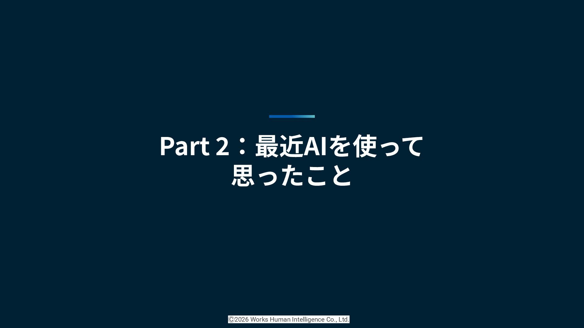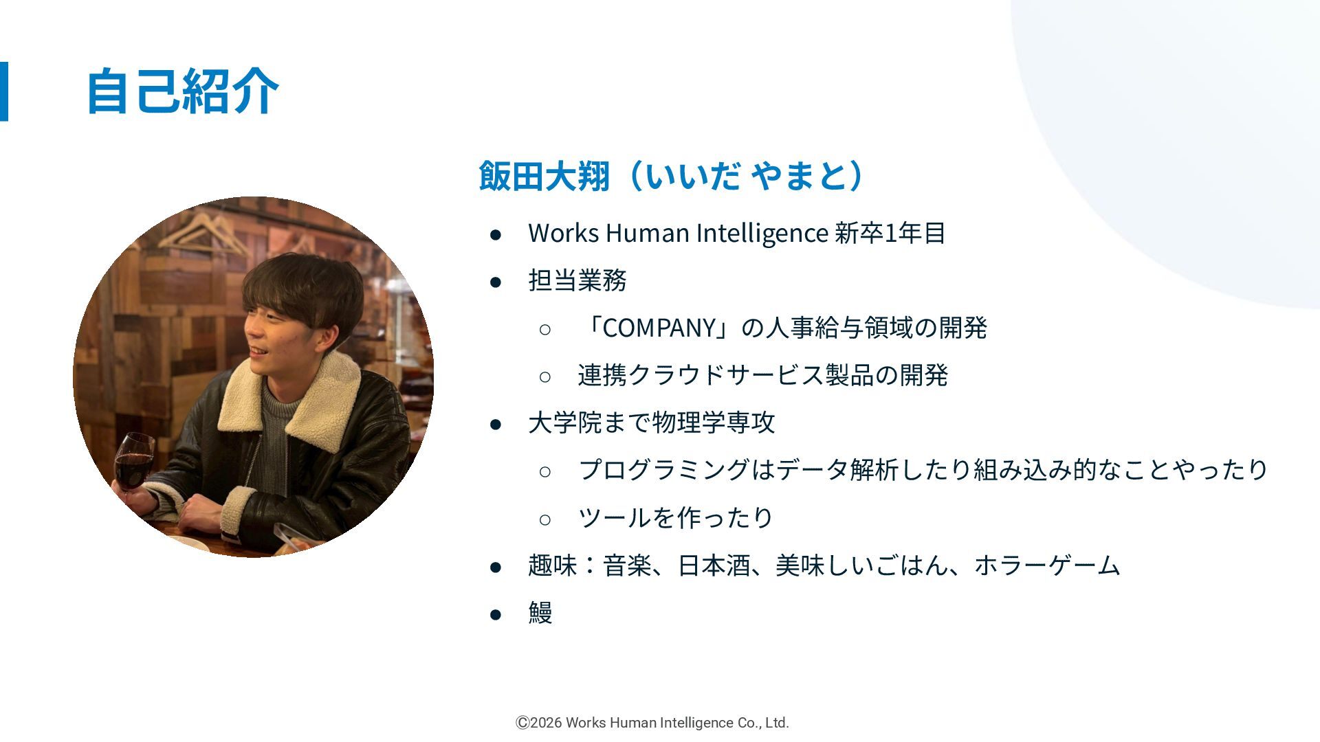 ◦ 「COMPANY」の⼈事給与領域の開発 ◦ 連携クラウドサービス製品の開発 • ⼤学院まで物理学専攻 ◦ プログラミングはデータ解析したり組み込み的なことやったり ◦ ツールを作ったり • 趣味:⾳楽、⽇本酒、美味しいごはん、ホラーゲーム • 鰻 Ⓒ2026 Works Human Intelligence Co., Ltd.