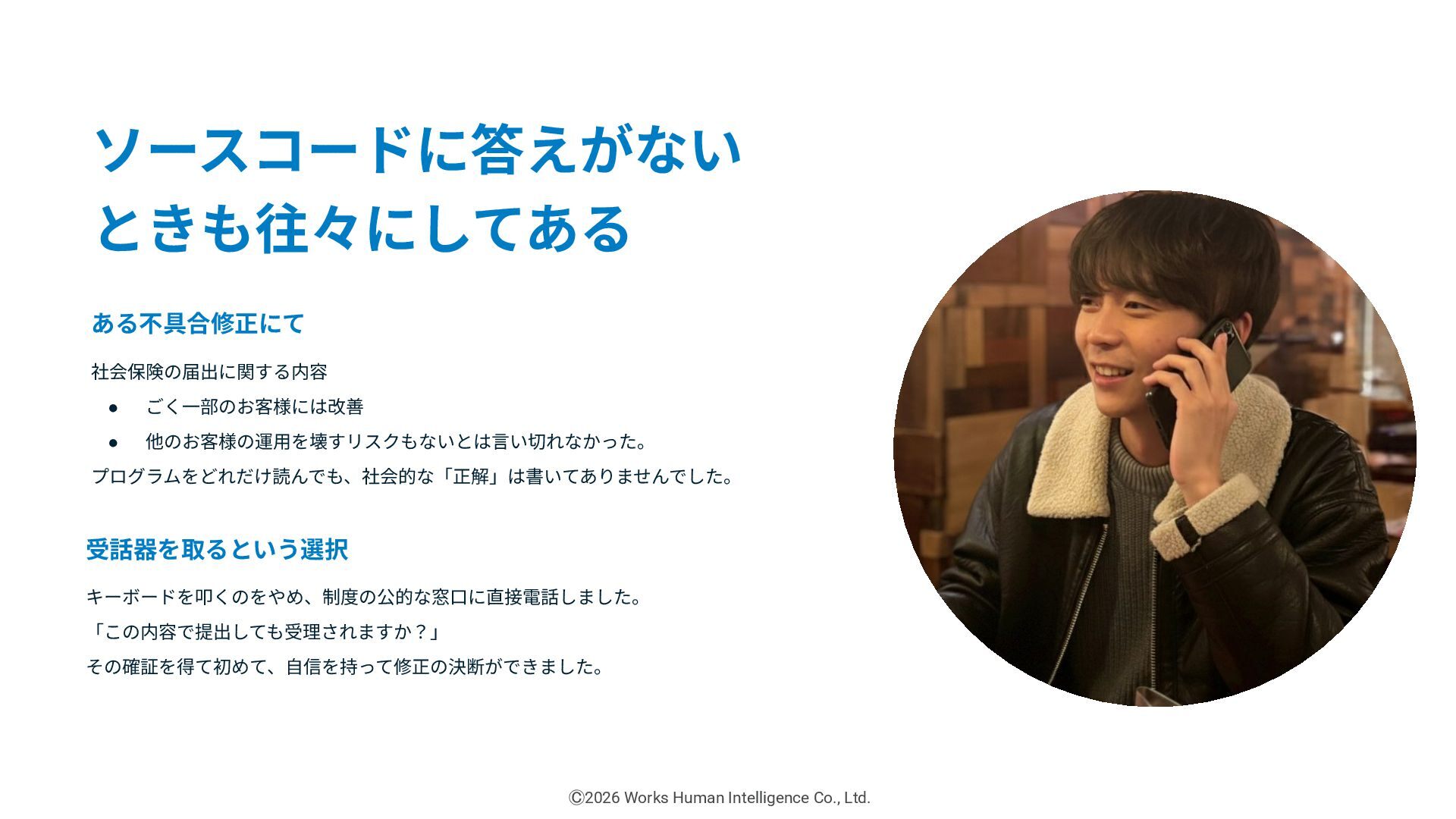 キーボードを叩くのをやめ、制度の公的な窓⼝に直接電話しました。 「この内容で提出しても受理されますか?」 その確証を得て初めて、⾃信を持って修正の決断ができました。 Ⓒ2026 Works Human Intelligence Co., Ltd.