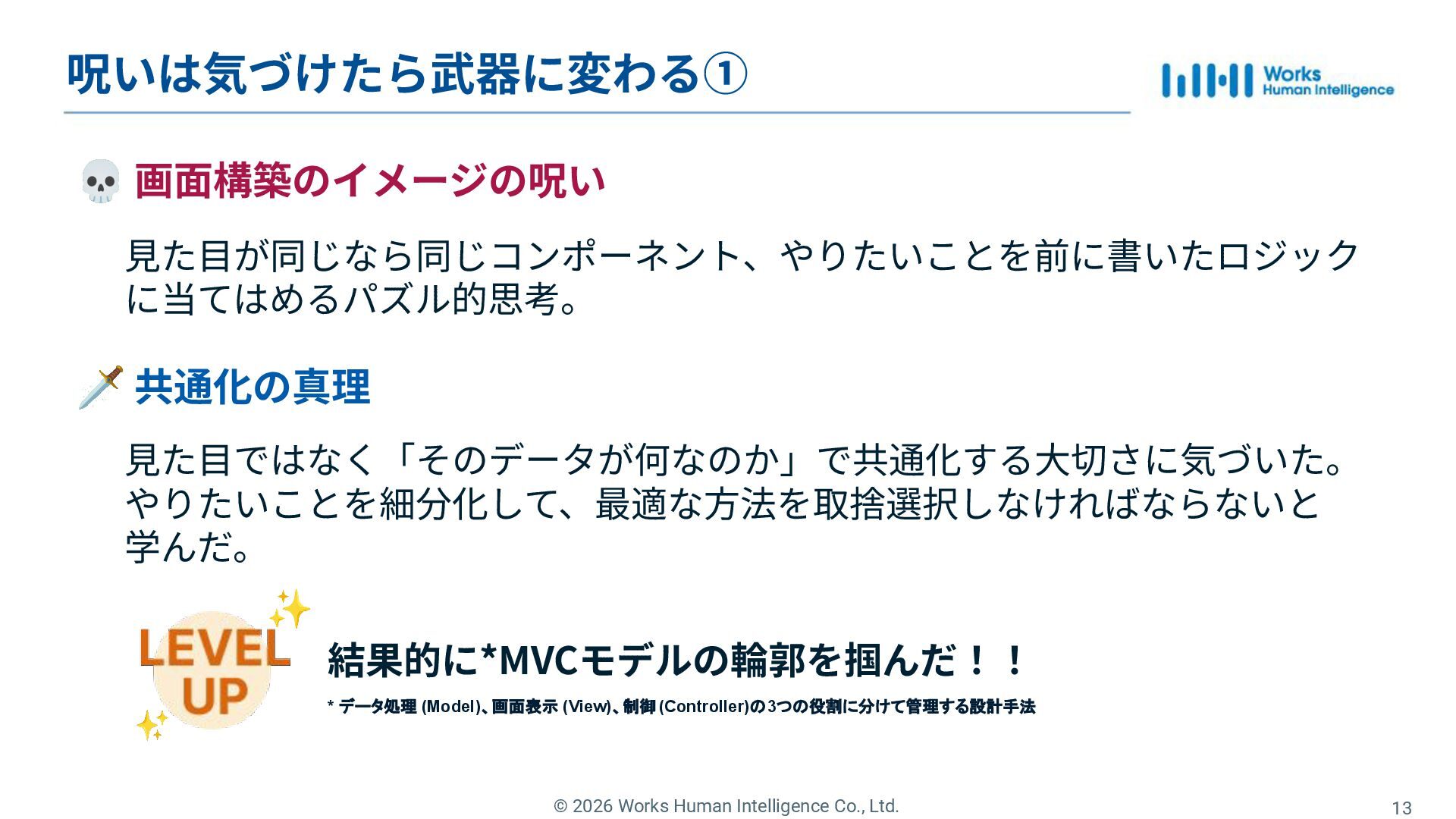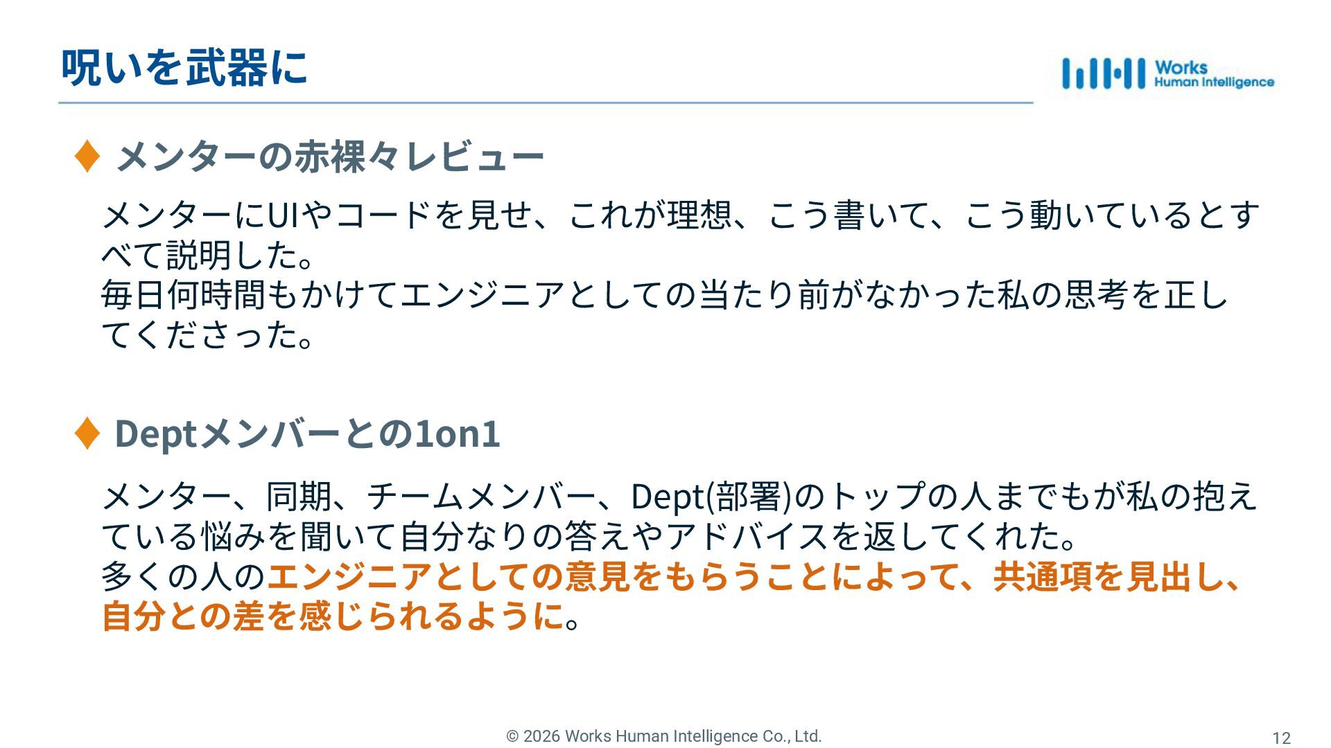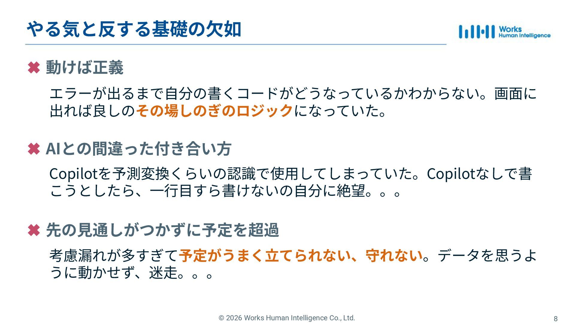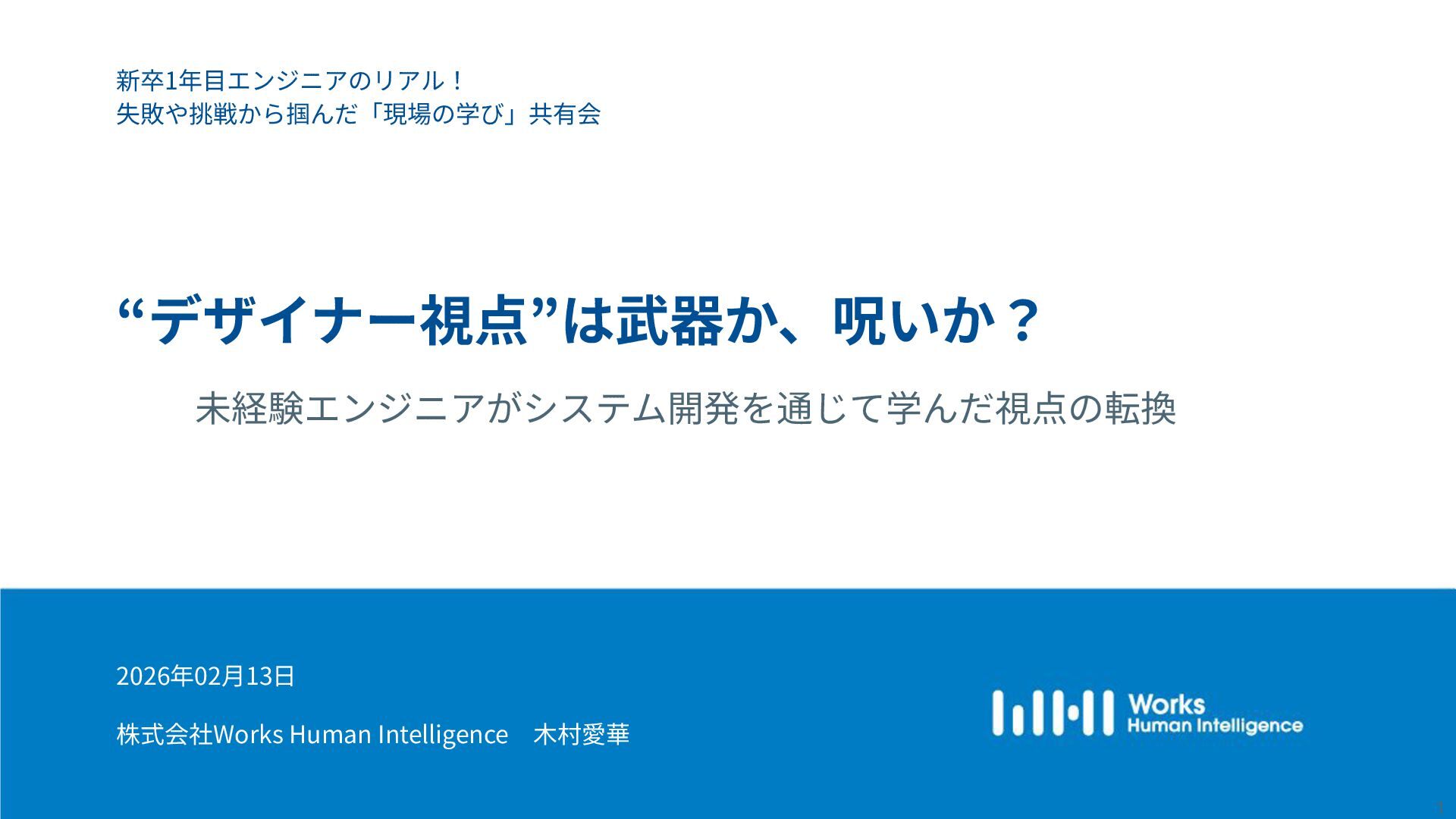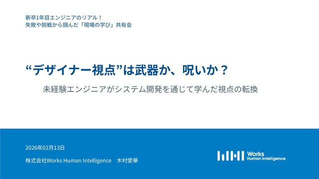 Works Human Intelligenceの新卒1年目のエンジニアたちが、現場で経験した「挑戦」と「失敗」、そしてその過程で手に入れた「学び」を共有するLT会の登壇資料です。