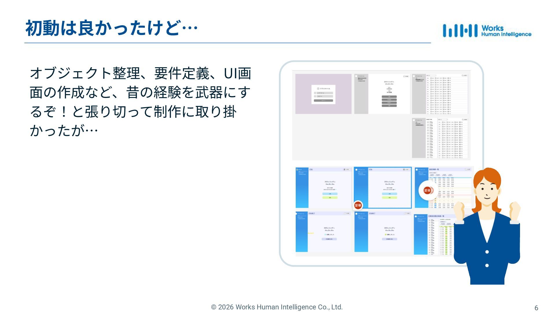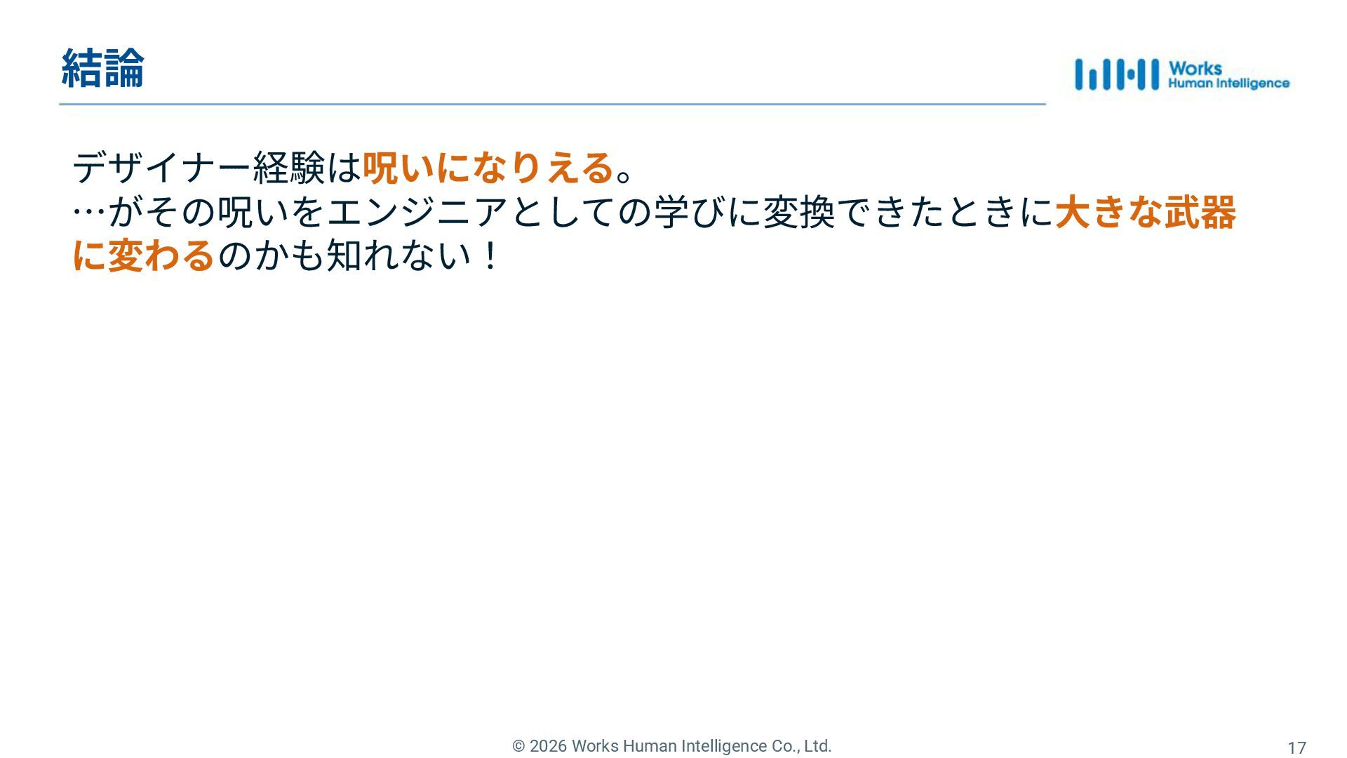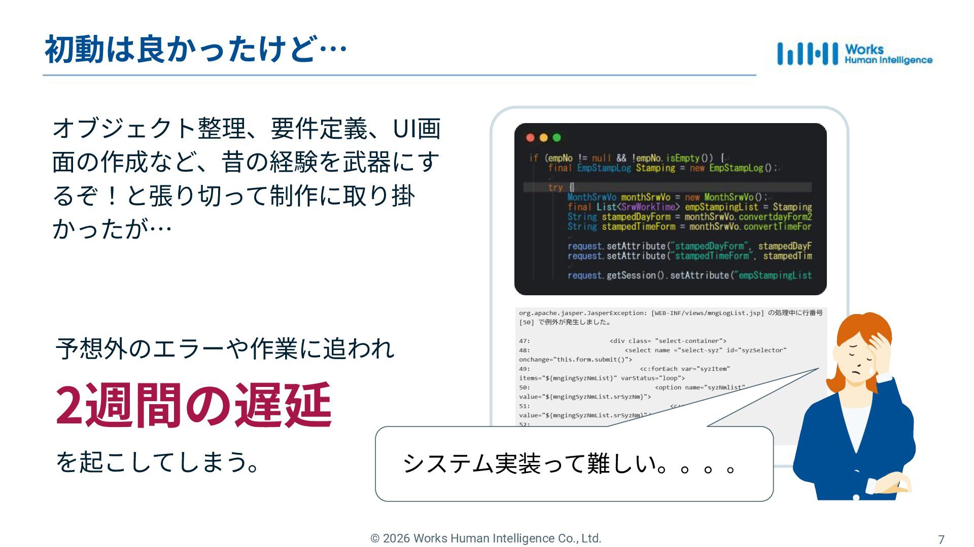 Works Human Intelligenceの新卒1年目のエンジニアたちが、現場で経験した「挑戦」と「失敗」、そしてその過程で手に入れた「学び」を共有するLT会の登壇資料です。