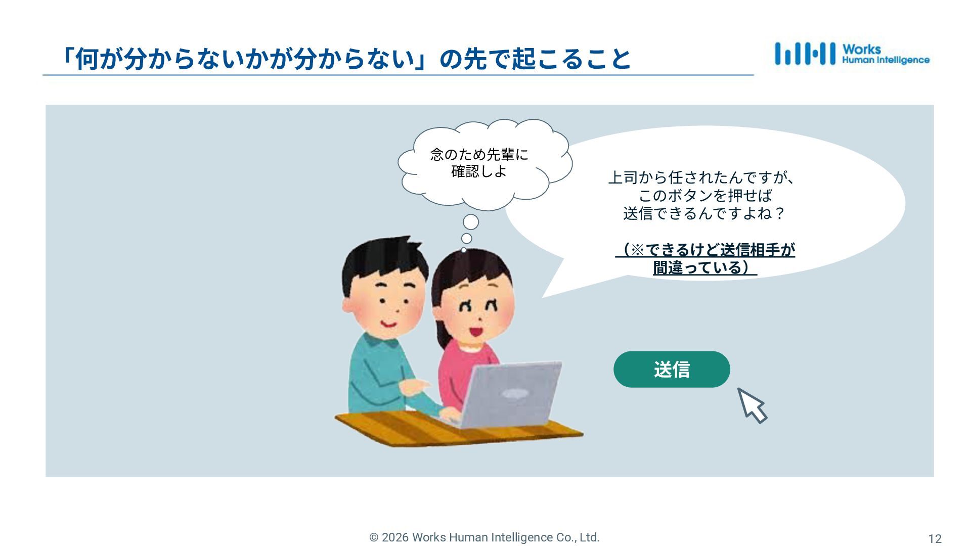 9. © 2026 Works Human Intelligence Co., Ltd. 12 「何が分からないかが分からない」の先で起こること 念のため先輩に