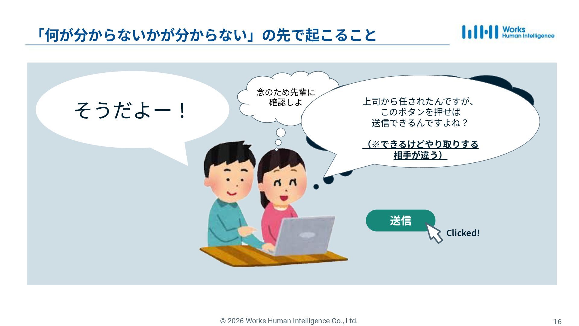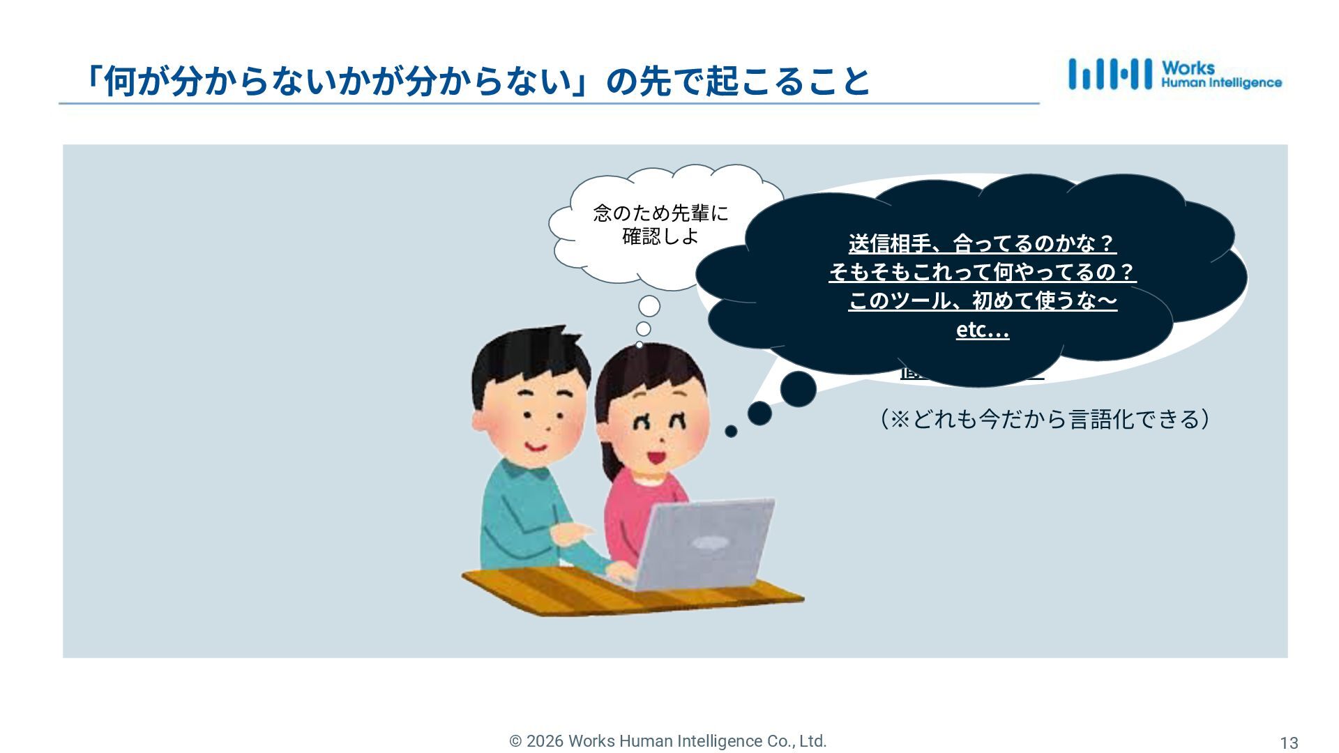 13. © 2026 Works Human Intelligence Co., Ltd. 16 「何が分からないかが分からない」の先で起こること 念のため先輩に