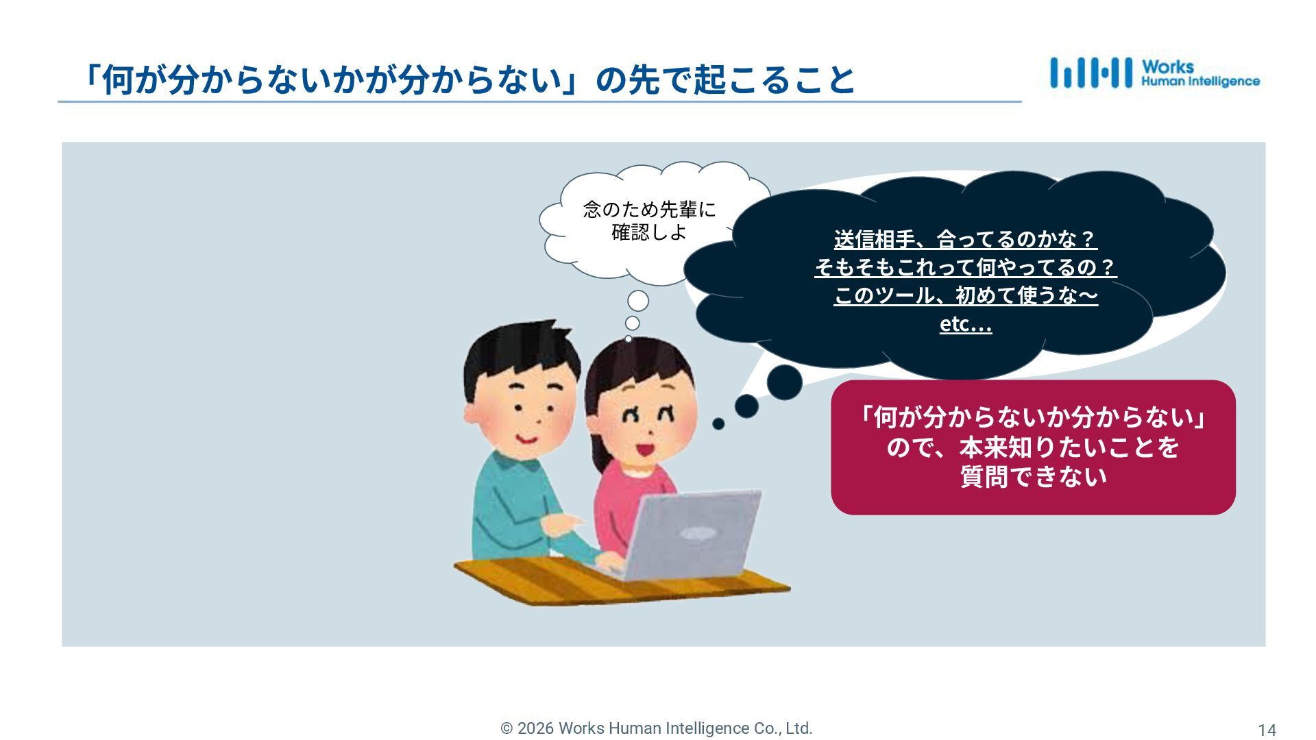 11. © 2026 Works Human Intelligence Co., Ltd. 14 「何が分からないかが分からない」の先で起こること 念のため先輩に