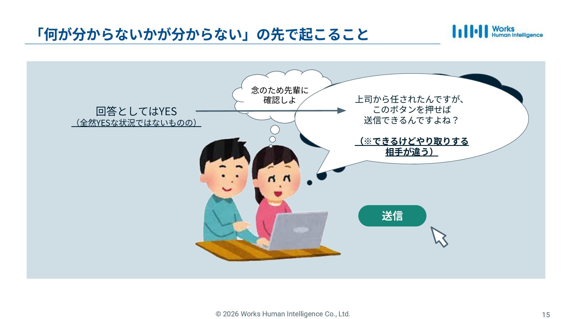 12. © 2026 Works Human Intelligence Co., Ltd. 15 「何が分からないかが分からない」の先で起こること 念のため先輩に