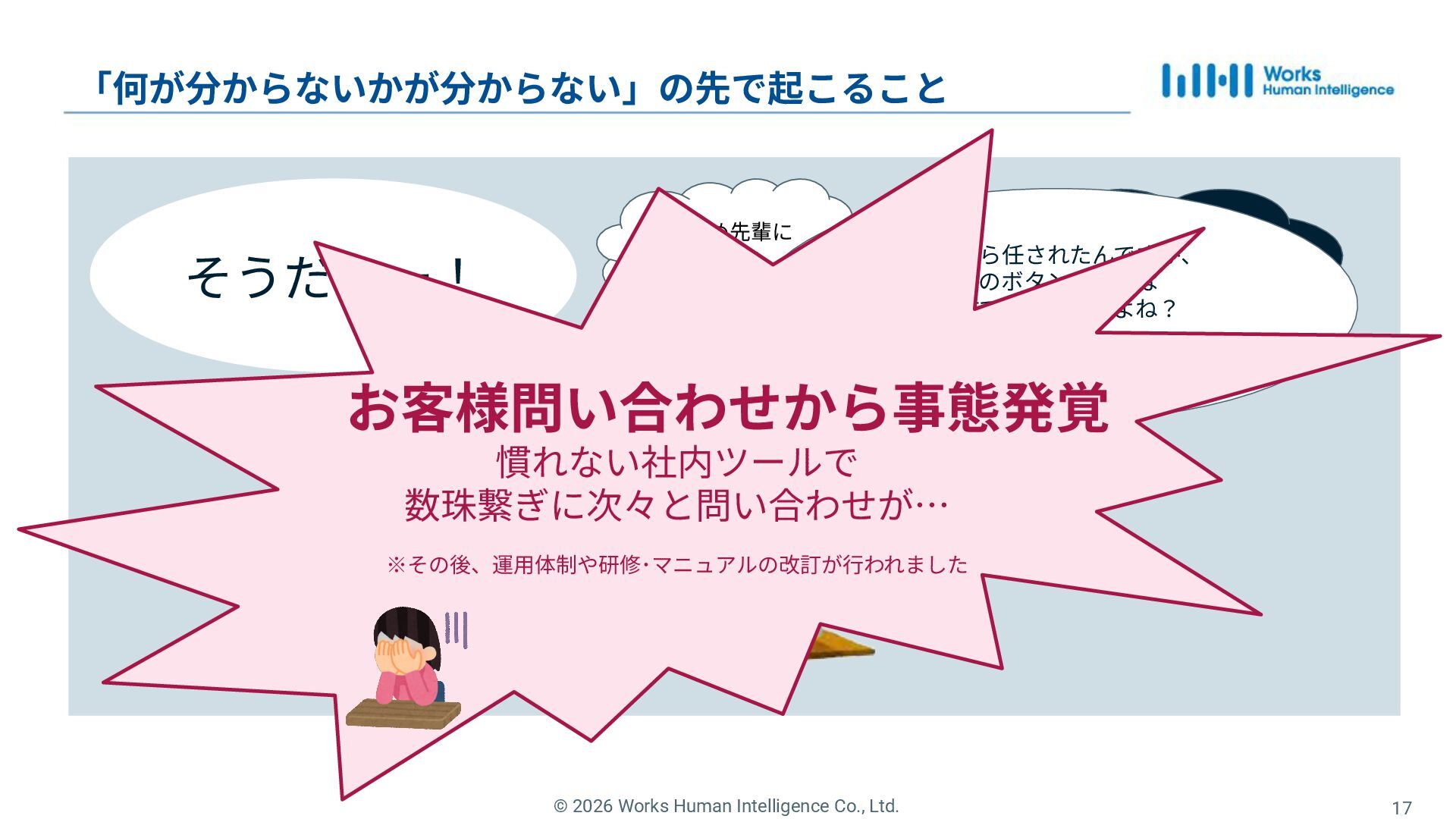 14. © 2026 Works Human Intelligence Co., Ltd. 17 「何が分からないかが分からない」の先で起こること 念のため先輩に