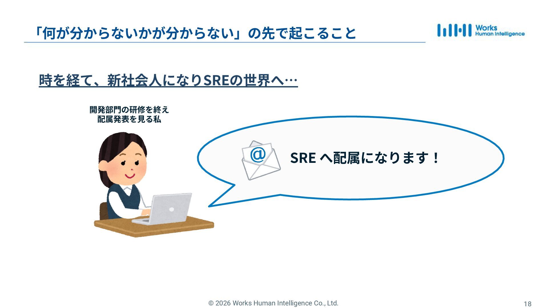 15. © 2026 Works Human Intelligence Co., Ltd. 20 「何が分からないかが分からない」の先で起こること 時を経て、新社会⼈になりSREの世界へ…