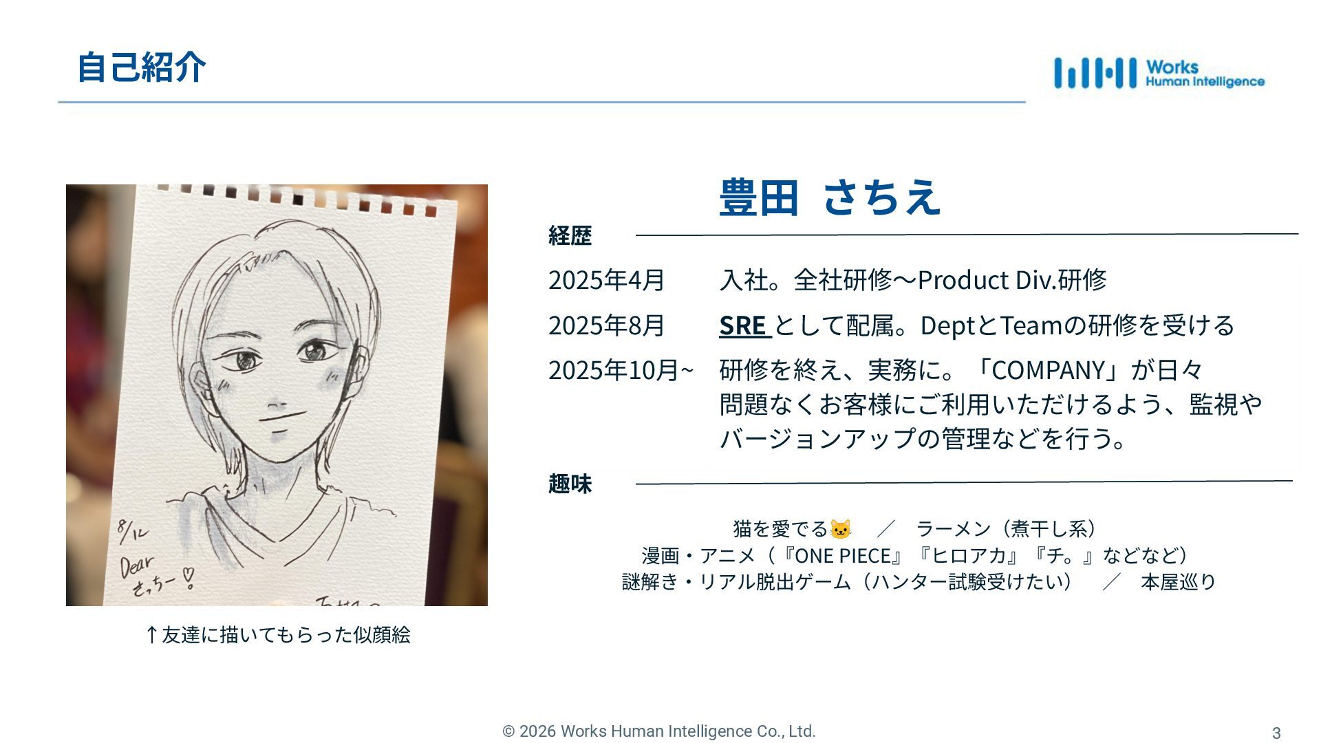 さちえ 猫を愛でる🐱  ∕ ラーメン(煮⼲し系) 漫画‧アニメ(『ONE PIECE』『ヒロアカ』『チ。』などなど) 謎解き‧リアル脱出ゲーム(ハンター試験受けたい) ∕ 本屋巡り  2025年4⽉ ⼊社。全社研修〜Product Div.研修 2025年8⽉ SRE として配属。DeptとTeamの研修を受ける 2025年10⽉~ 研修を終え、実務に。「COMPANY」が⽇々 問題なくお客様にご利⽤いただけるよう、監視や バージョンアップの管理などを⾏う。 経歴 趣味 ↑友達に描いてもらった似顔絵