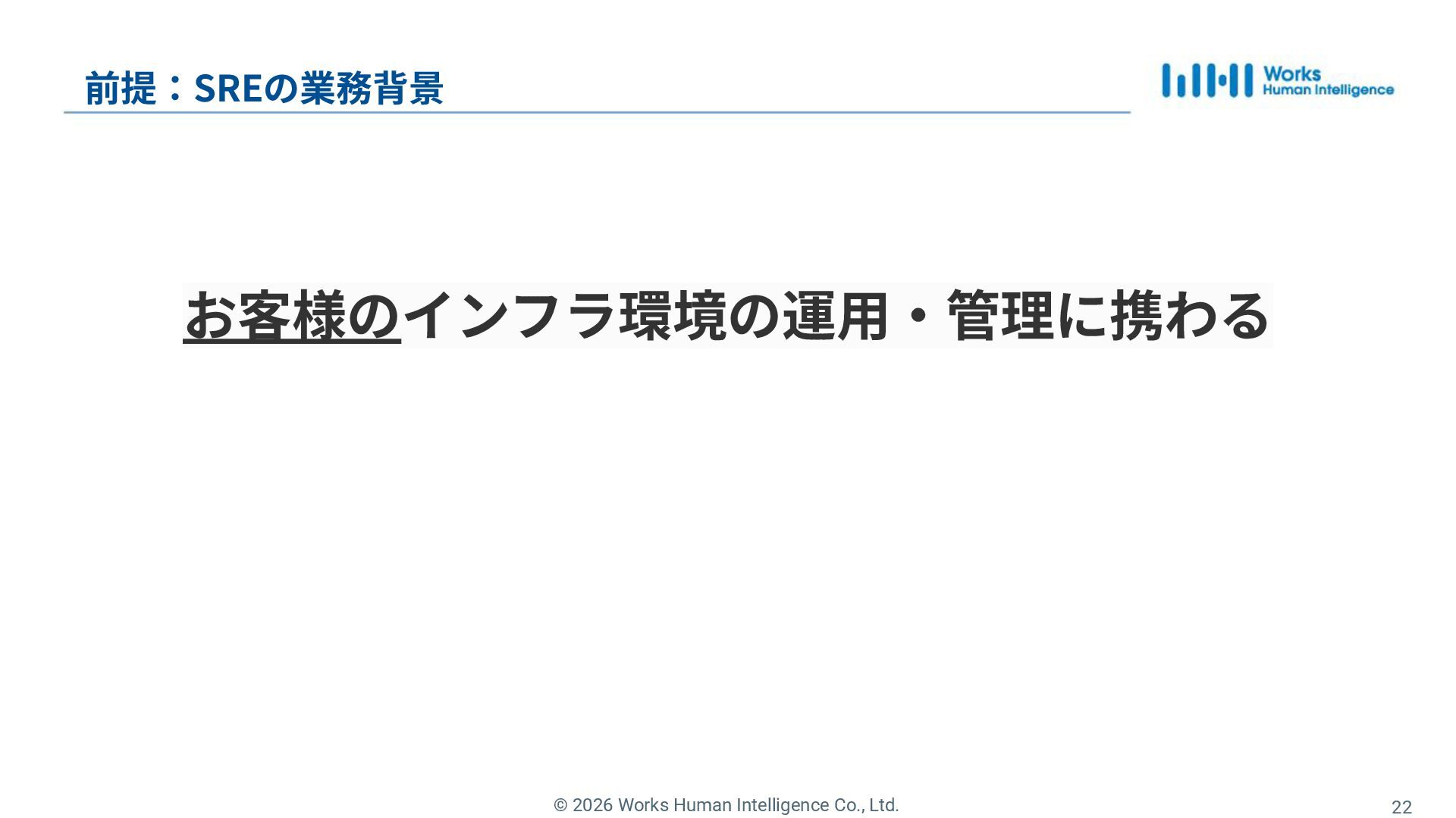 16. © 2026 Works Human Intelligence Co., Ltd. 23 前提:SREの業務背景 お客様のインフラ環境の運⽤‧管理に携わる