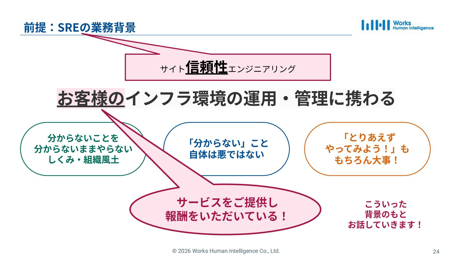17. © 2026 Works Human Intelligence Co., Ltd. 24 前提:SREの業務背景 お客様のインフラ環境の運⽤‧管理に携わる