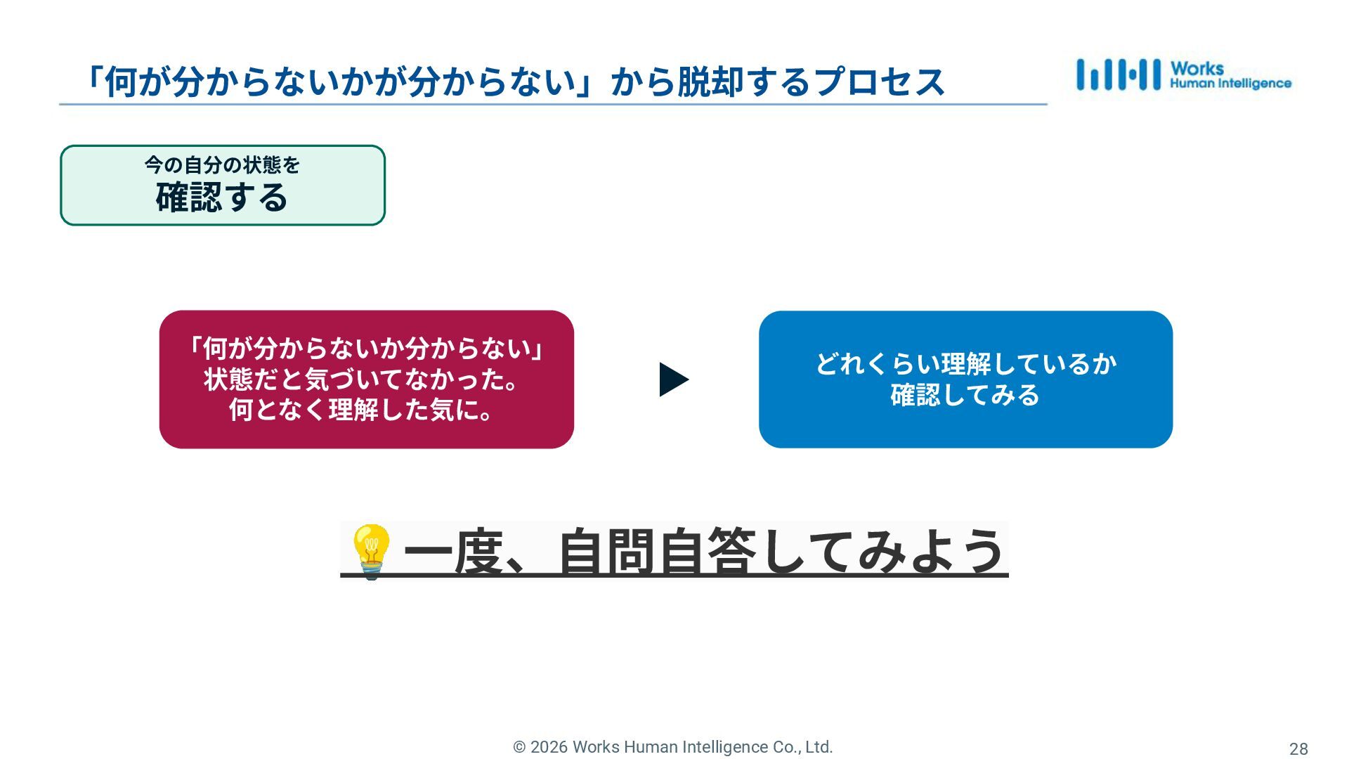 28. © 2026 Works Human Intelligence Co., Ltd. 分からないを 解消する 「何が分からないかが分からない」から脱却するプロセス