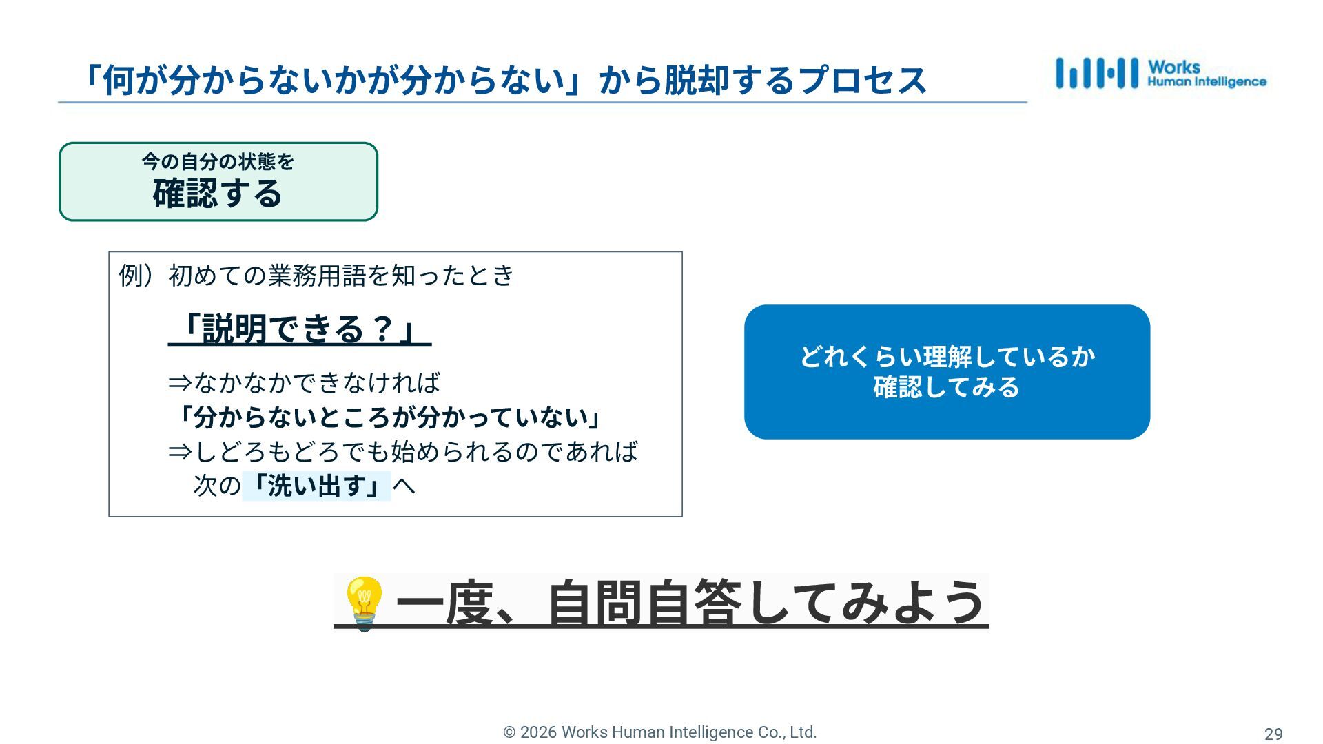 21. © 2026 Works Human Intelligence Co., Ltd. 「何が分からないかが分からない」から脱却するプロセス 29 どれくらい理解しているか