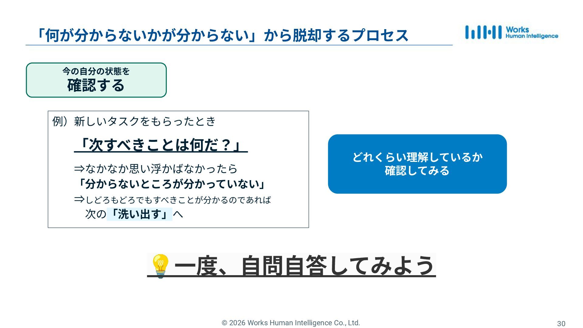 30. © 2026 Works Human Intelligence Co., Ltd. 分からないを 解消する 「何が分からないかが分からない」から脱却するプロセス