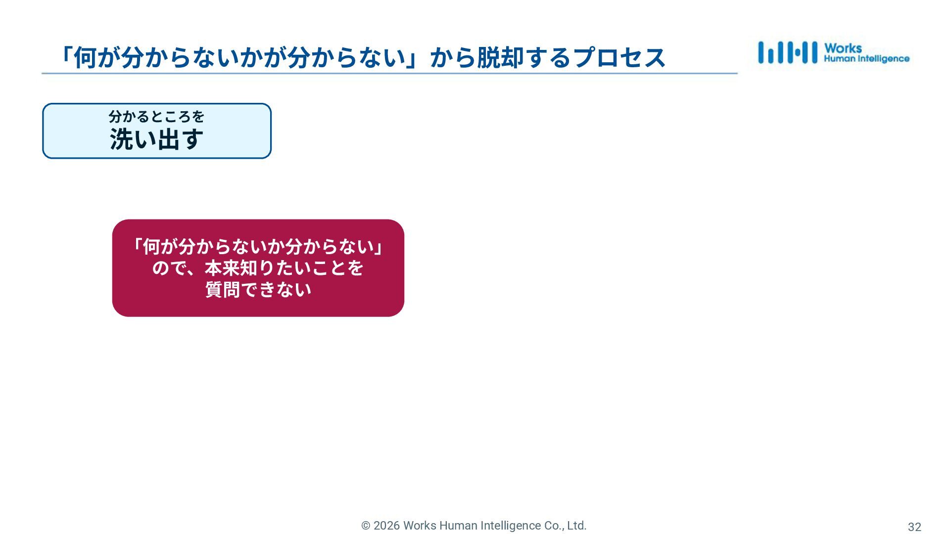 32. © 2026 Works Human Intelligence Co., Ltd. 分からないを 解消する 「何が分からないかが分からない」から脱却するプロセス
