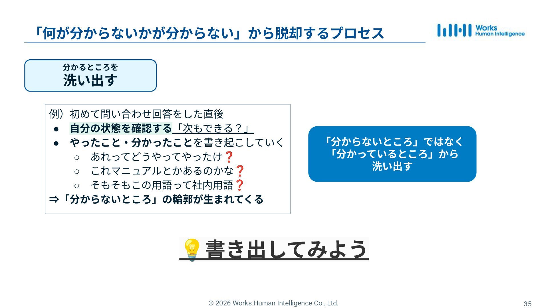 27. © 2026 Works Human Intelligence Co., Ltd. 💡書き出してみよう 「何が分からないかが分からない」から脱却するプロセス 35