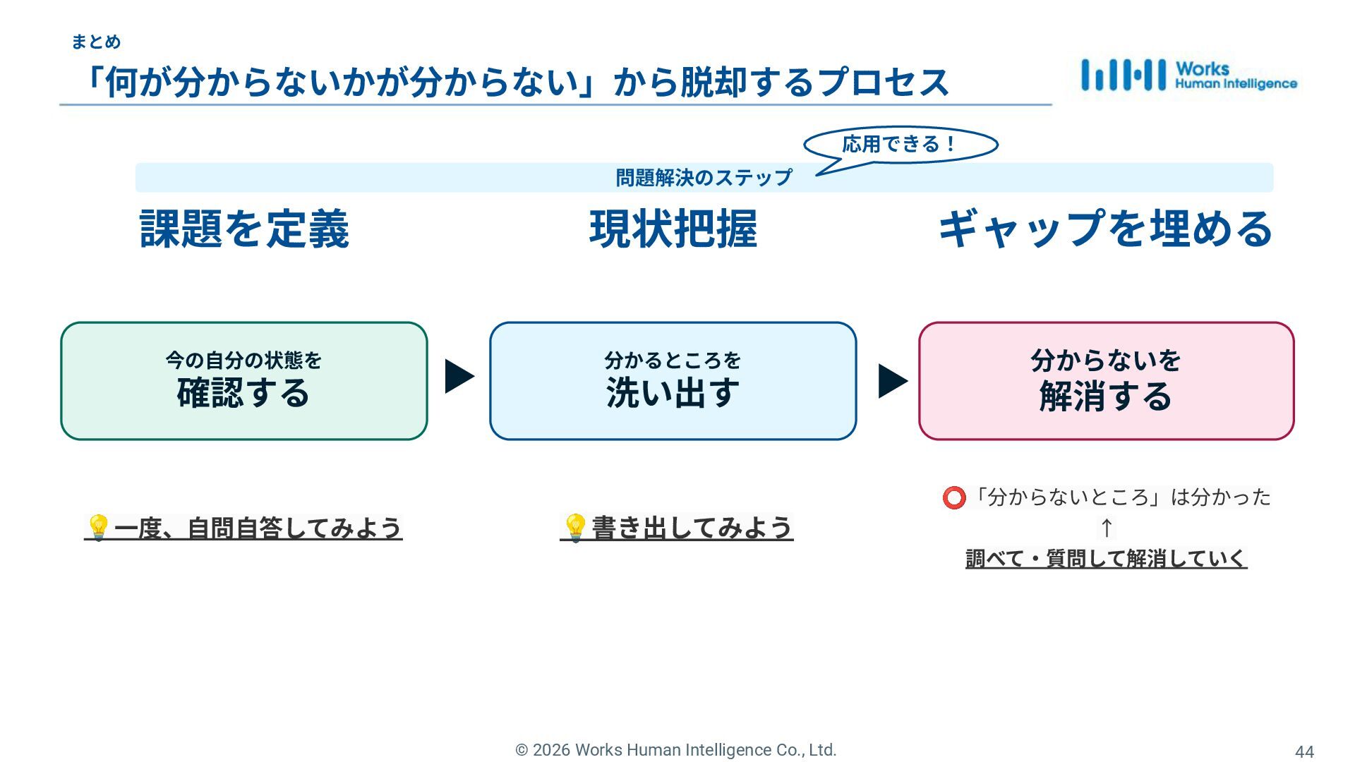36. © 2026 Works Human Intelligence Co., Ltd. まとめ 「何が分からないかが分からない」から脱却するプロセス 44