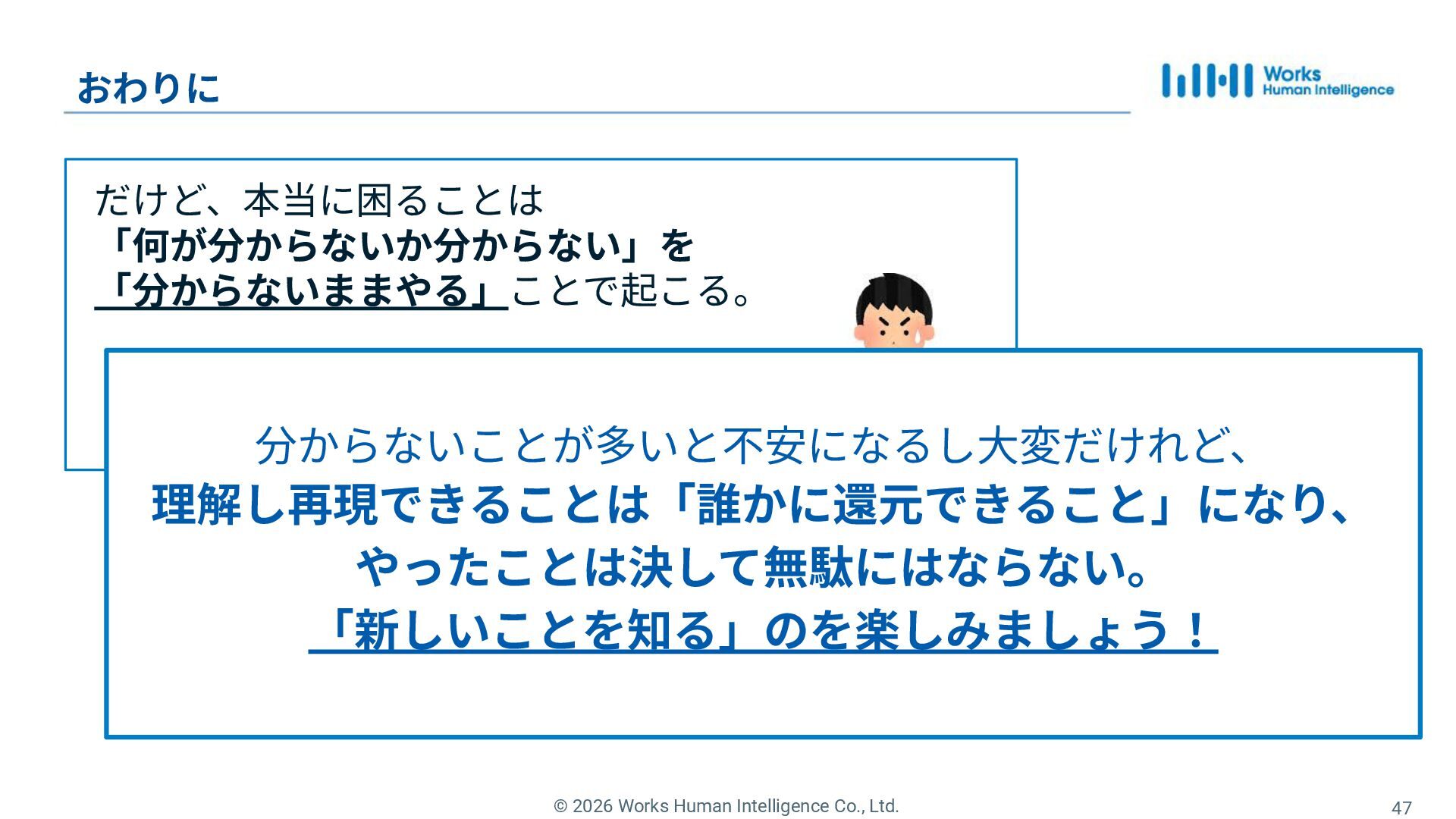 38. © 2026 Works Human Intelligence Co., Ltd. 47 おわりに だけど、本当に困ることは