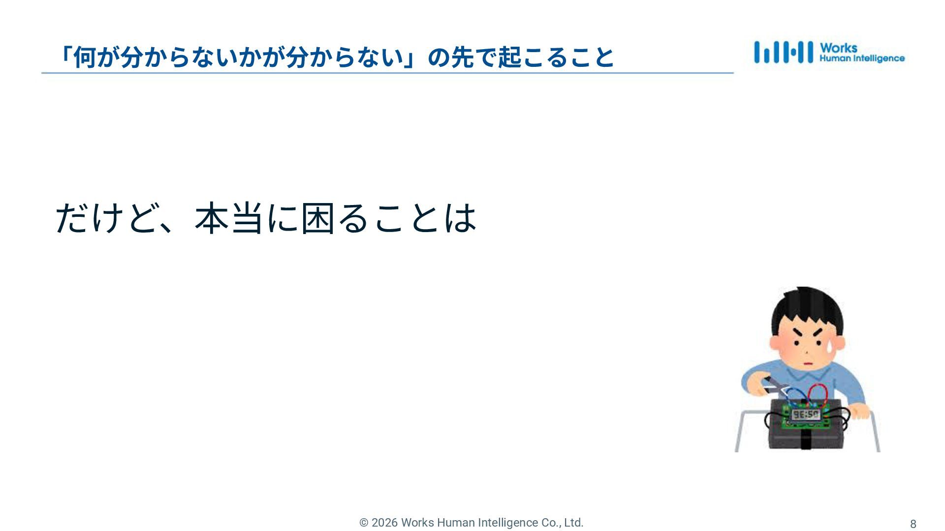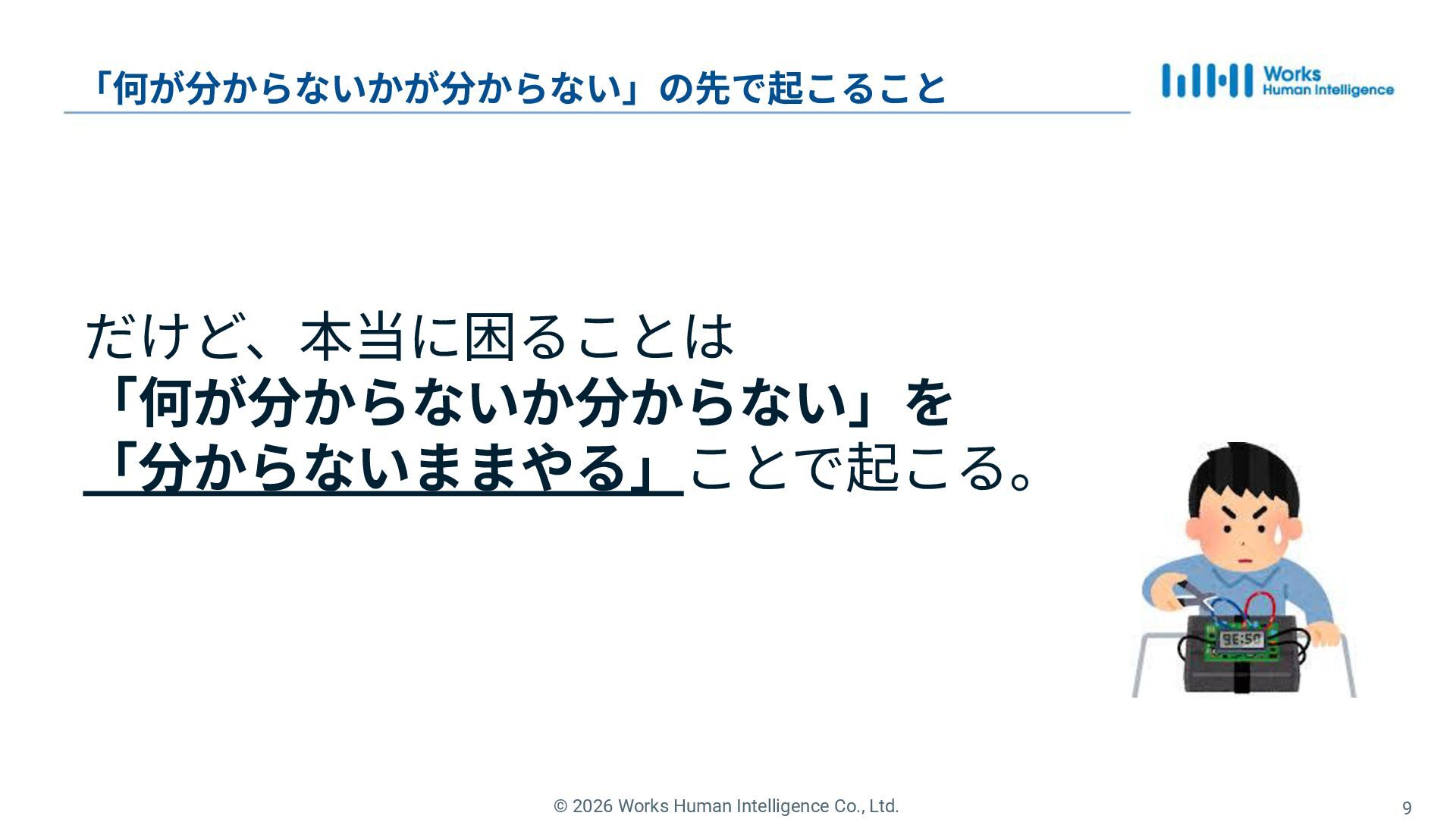 6. © 2026 Works Human Intelligence Co., Ltd. 9 「何が分からないかが分からない」の先で起こること だけど、本当に困ることは