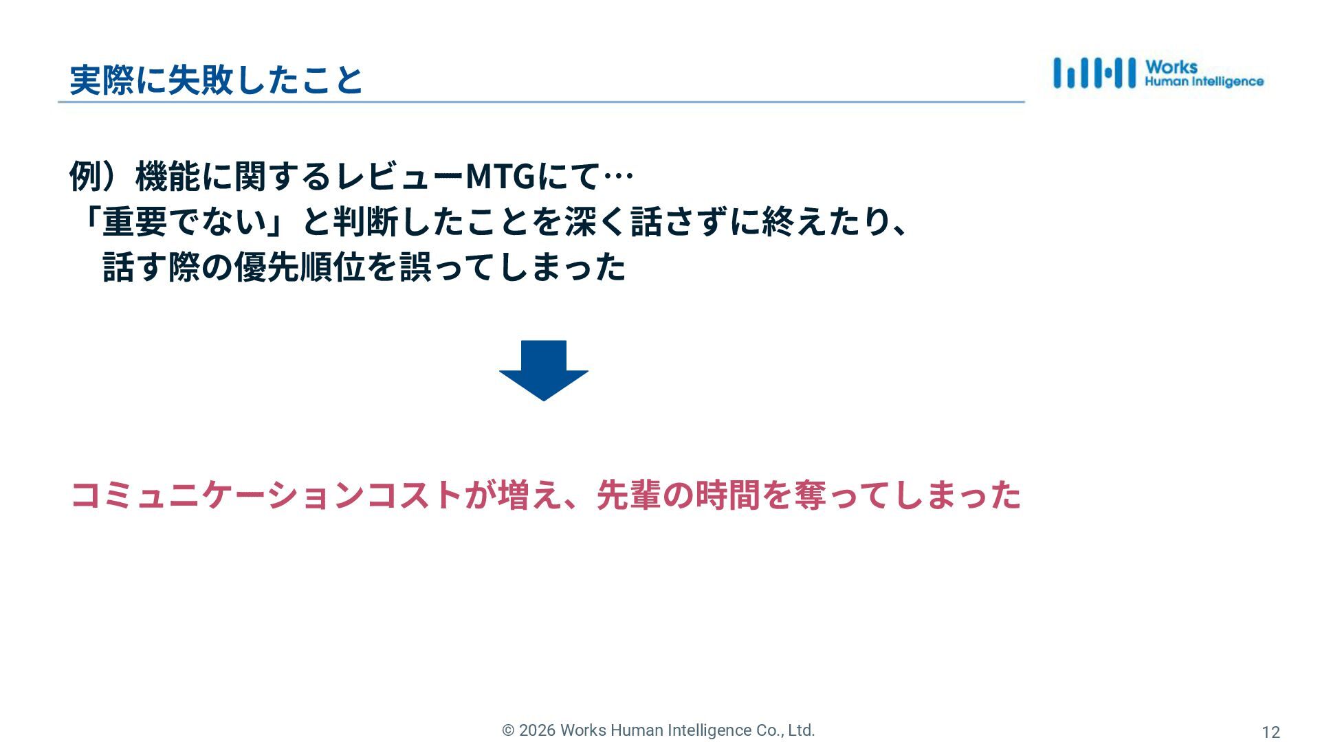5. © 2026 Works Human Intelligence Co., Ltd. 12 実際に失敗したこと 例)機能に関するレビューMTGにて…