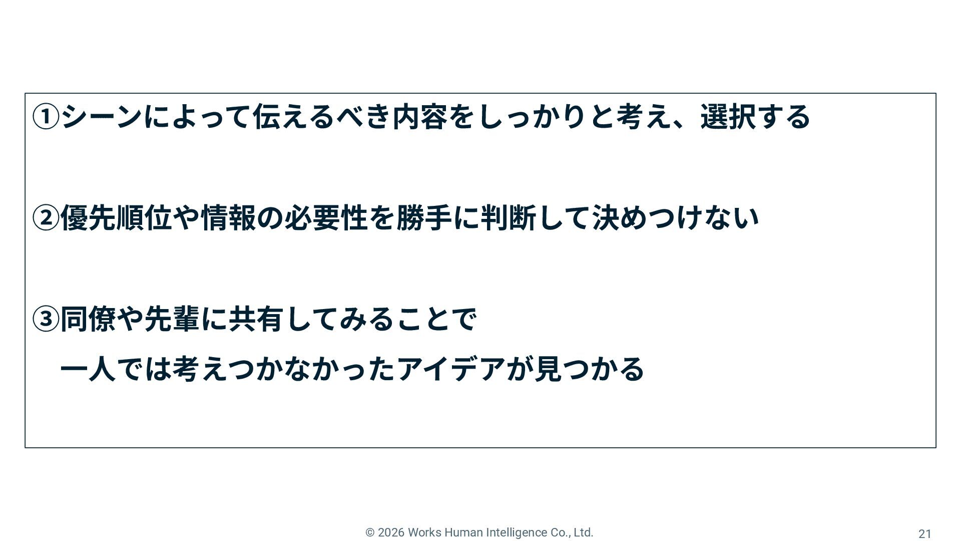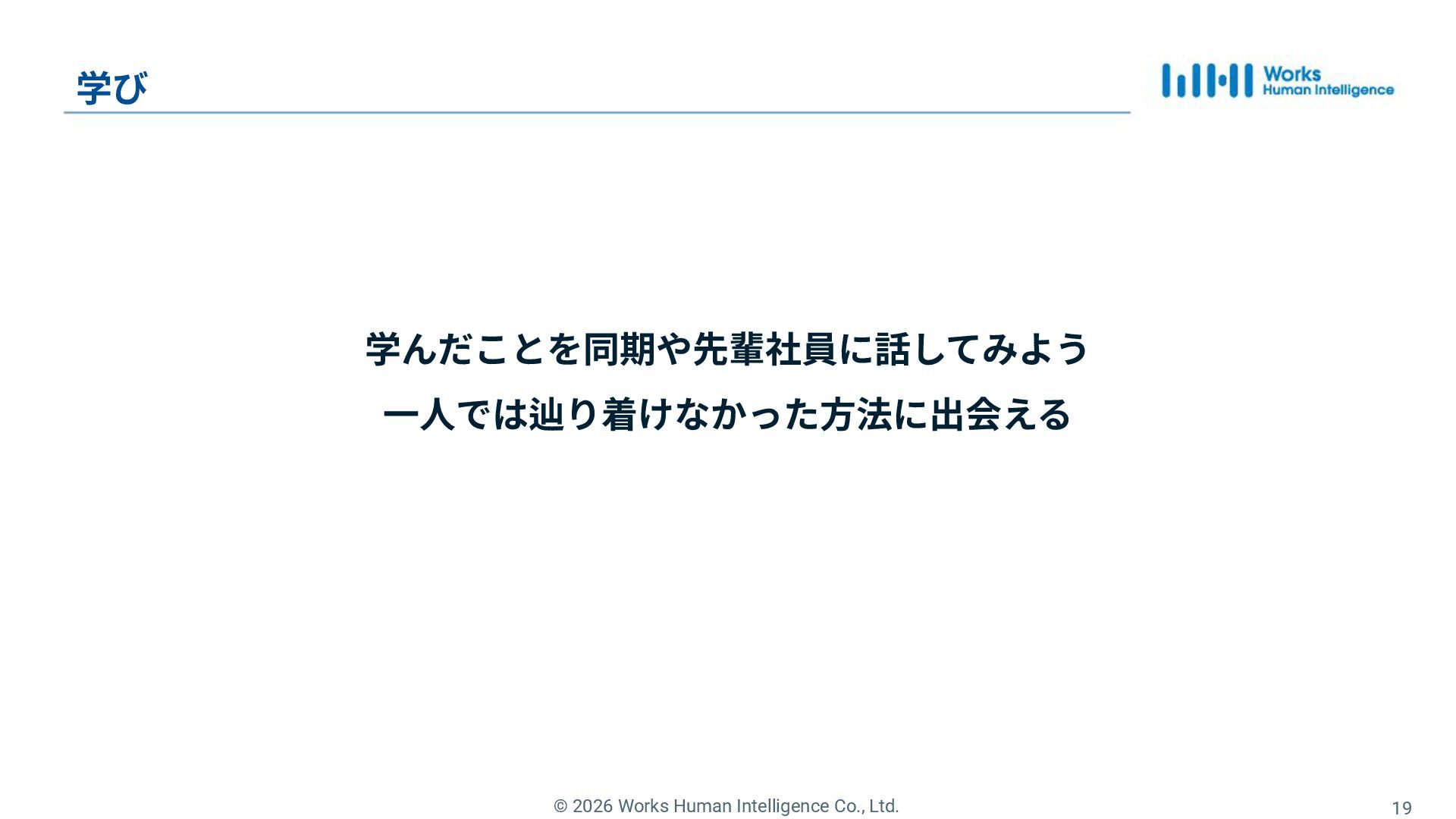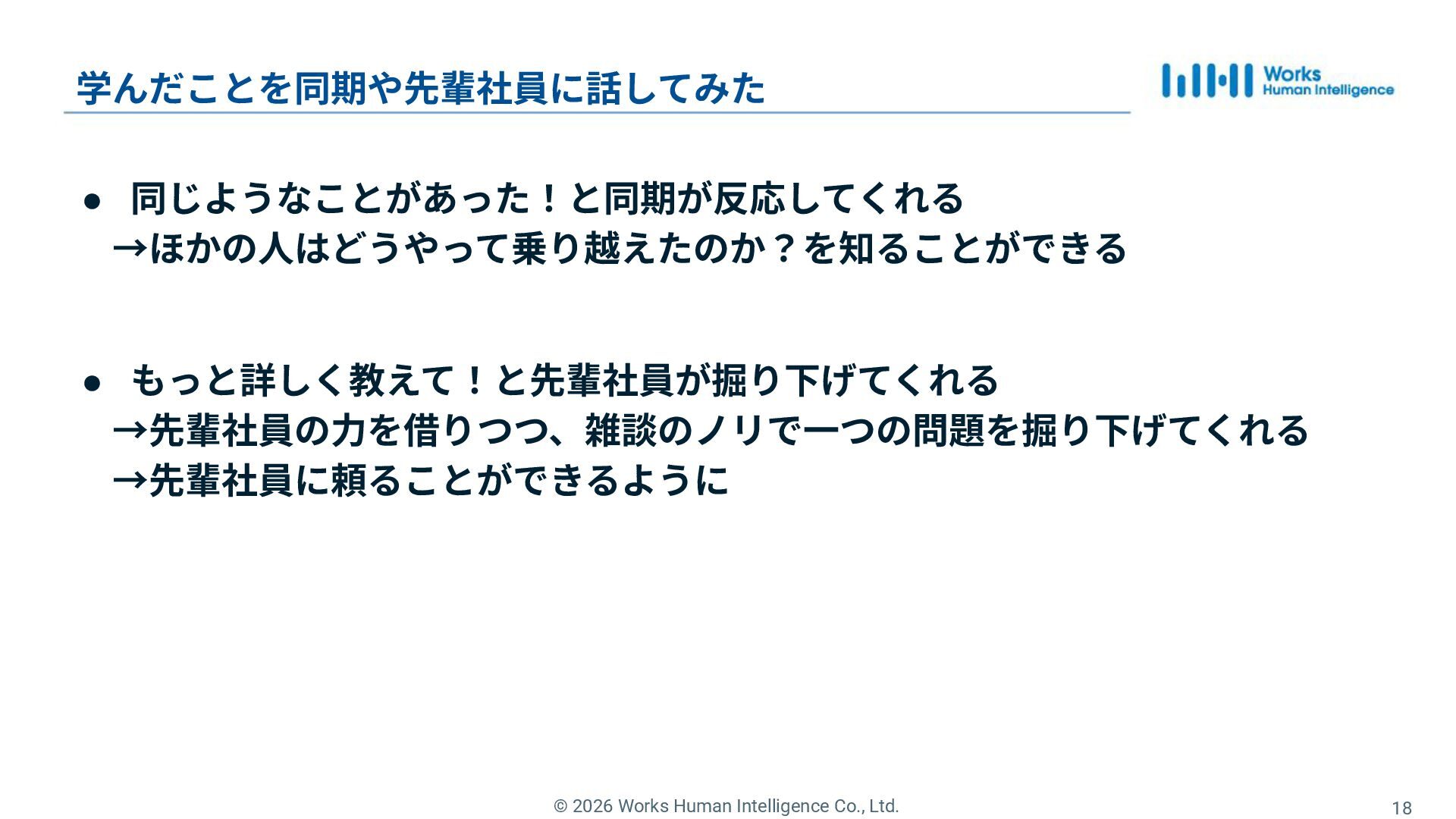 9. © 2026 Works Human Intelligence Co., Ltd. 18 学んだことを同期や先輩社員に話してみた •
