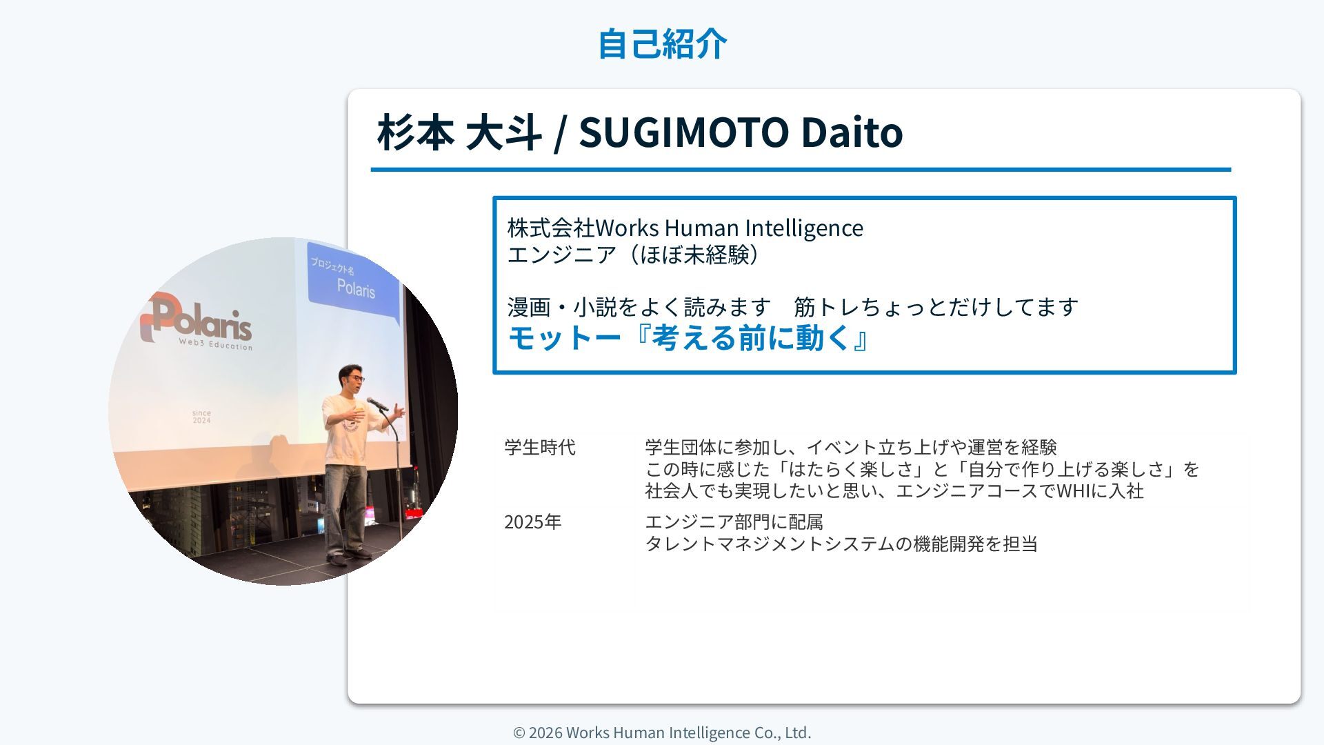 / SUGIMOTO Daito 株式会社Works Human Intelligence エンジニア(ほぼ未経験) 漫画‧⼩説をよく読みます 筋トレちょっとだけしてます モットー『考える前に動く』 学⽣時代 学⽣団体に参加し、イベント⽴ち上げや運営を経験 この時に感じた「はたらく楽しさ」と「⾃分で作り上げる楽しさ」を 社会⼈でも実現したいと思い、エンジニアコースでWHIに⼊社 2025年 エンジニア部⾨に配属 タレントマネジメントシステムの機能開発を担当