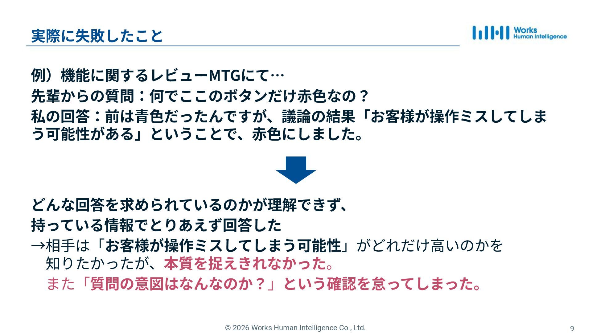 3. © 2026 Works Human Intelligence Co., Ltd. 9 実際に失敗したこと 例)機能に関するレビューMTGにて…