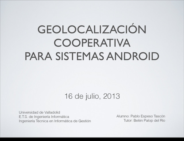 Documento de presentación del Proyecto Fin de Carrera "Geolocalización Cooperativa para sistemas Android", presentado el 16 de julio de 2013 por Pablo Espeso Tascón para optar por el título de Ingeniero Técnico en Informática de Gestión por la Universidad de Valladolid.