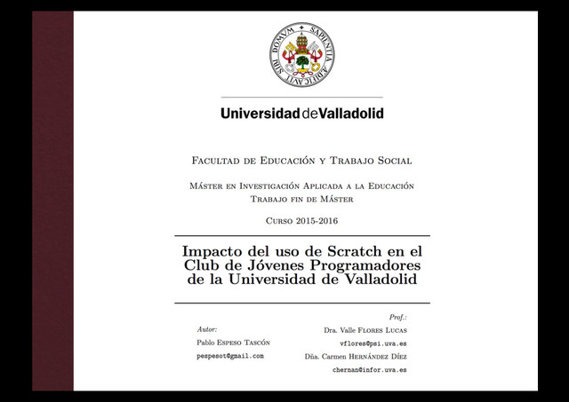 Documento para la presentación del Trabajo Fin de Máster "Impacto del uso de Scratch en el Club de Jóvenes Programadores de la Unviersidad de Valladolid", para optar al título de Máster en Investigación Aplicada a la Educación de la Universidad de Valladolid, en el curso 2015-2016.