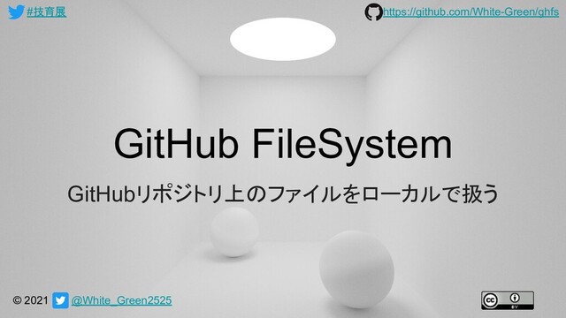 技育展2021( https://talent.supporterz.jp/geekten/2021/ )でGitHub FileSystem( https://github.com/White-Green/ghfs )に関して発表した際の資料 元ファイルはこちら https://docs.google.com/presentation/d/1vh8daD0OG1euff1rWOp_JyNzhkELseHrLP48J13OI1Y/edit?usp=sharing