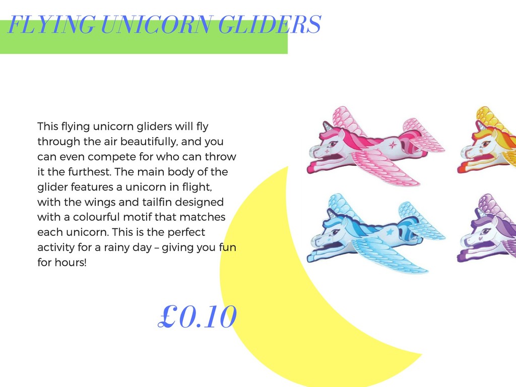 the air beautifully, and you can even compete for who can throw it the furthest. The main body of the glider features a unicorn in flight, with the wings and tailfin designed with a colourful motif that matches each unicorn. This is the perfect activity for a rainy day – giving you fun for hours! £0.10