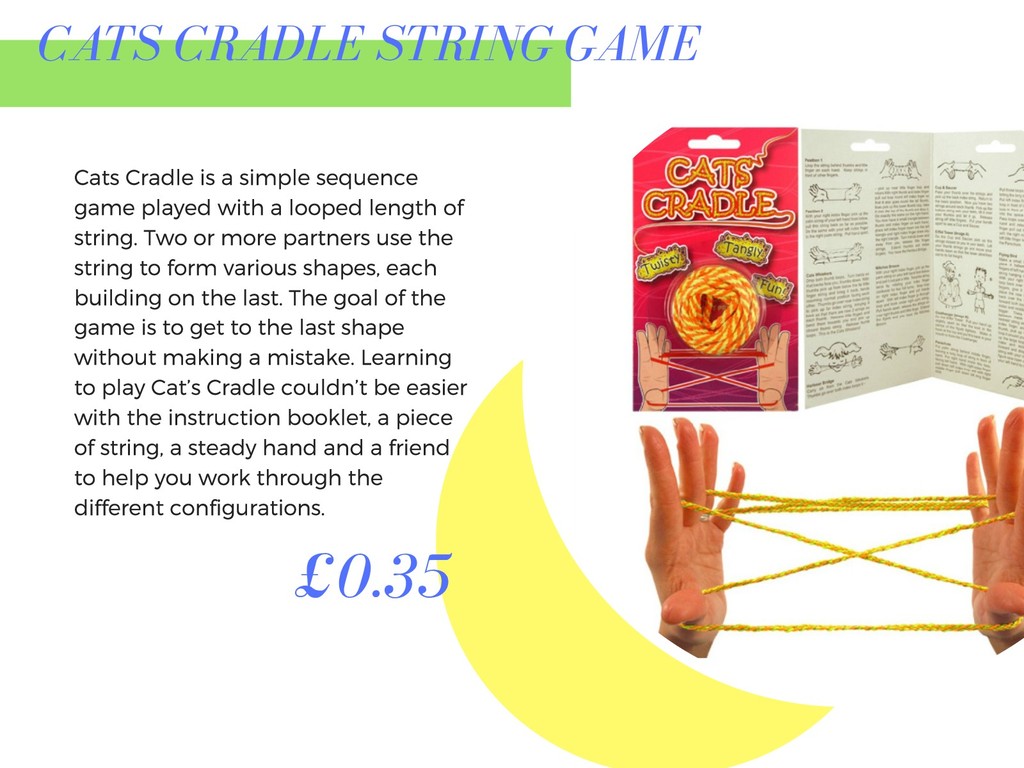 game played with a looped length of string. Two or more partners use the string to form various shapes, each building on the last. The goal of the game is to get to the last shape without making a mistake. Learning to play Cat’s Cradle couldn’t be easier with the instruction booklet, a piece of string, a steady hand and a friend to help you work through the different configurations. £0.35