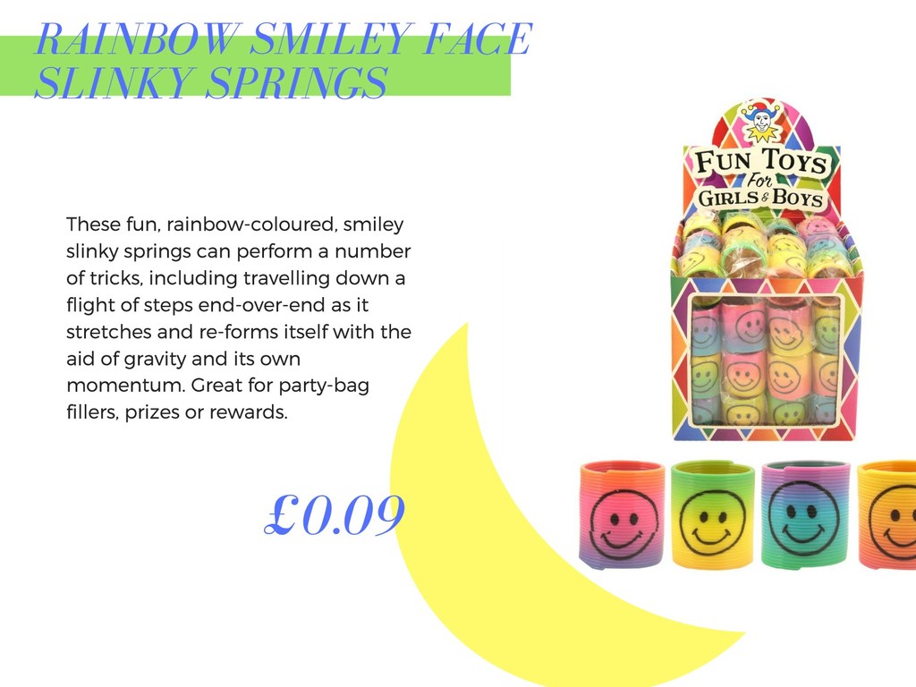 springs can perform a number of tricks, including travelling down a flight of steps end-over-end as it stretches and re-forms itself with the aid of gravity and its own momentum. Great for party-bag fillers, prizes or rewards. £0.09