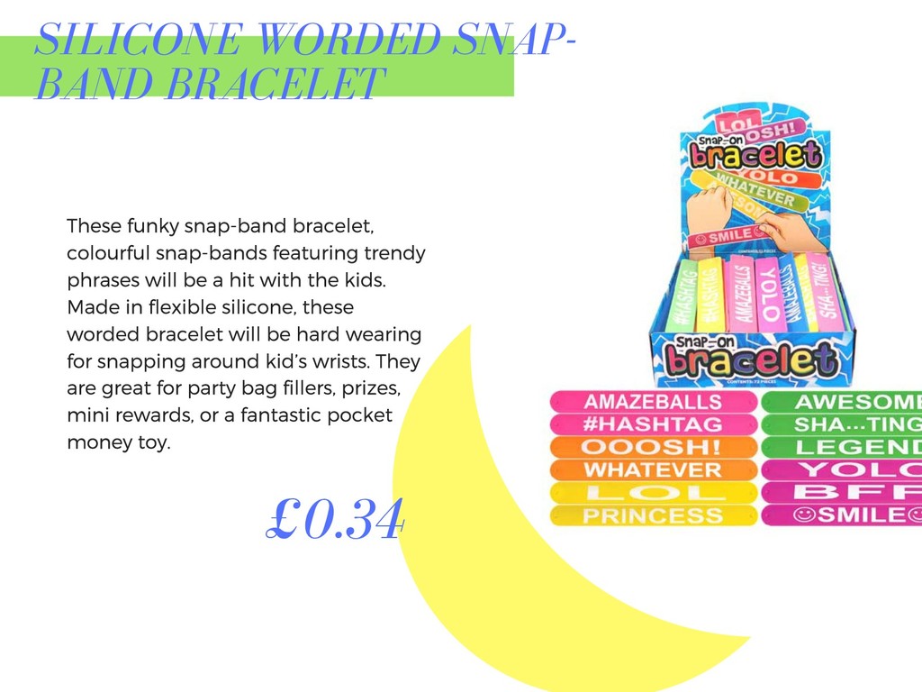snap-bands featuring trendy phrases will be a hit with the kids. Made in flexible silicone, these worded bracelet will be hard wearing for snapping around kid’s wrists. They are great for party bag fillers, prizes, mini rewards, or a fantastic pocket money toy. £0.34