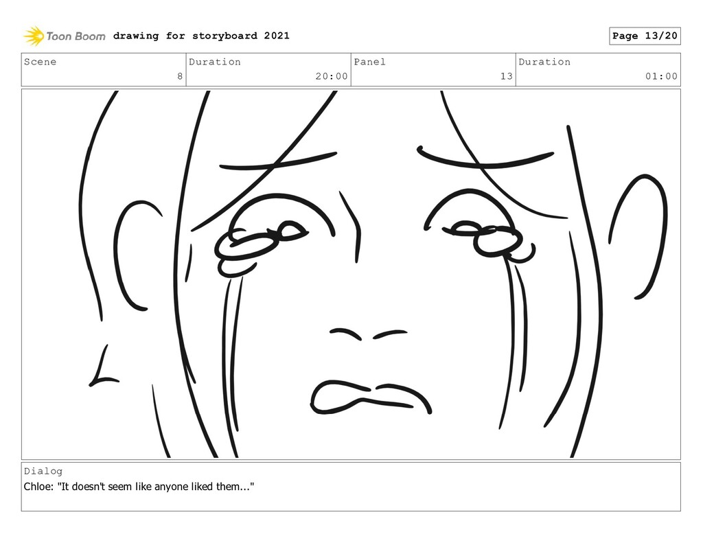 Scene 8 Duration 20:00 Panel 13 Duration 01:00 Dialog Chloe: