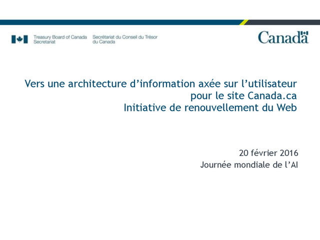les preuves est un principe de base du projet • Cycles itératifs trimestriels de conception, d’essai et d’amélioration entrepris avec des consultants spécialisés • Accent placé sur : • la réussite des tâches principales sur le site Canada.ca • les approches communes – modèles d’AI, menus de navigation, gabarits de page, modèles de conception, Boîte à outils de l’expérience Web (BOEW) Éléments mis à l’essai Raison de l’essai Composantes de la BOEW • Améliorer les composantes existantes, cerner les lacunes, générer de nouvelles conceptions Prototypes du site Canada.ca • Évaluer les gabarits de page proposés, les modèles d’AI, les modèles de conception Appareils mobiles • Générer et améliorer des modèles de conception pour les appareils mobiles • Mettre à l’essai les gabarits de page et les modèles d’AI adoptés Appareils fonctionnels • Valider l’utilité des codes conformes aux Directives pour l’accessibilité aux contenus Web (DACW) • Mettre à l’essai les gabarits de page et les modèles d’AI adoptés
