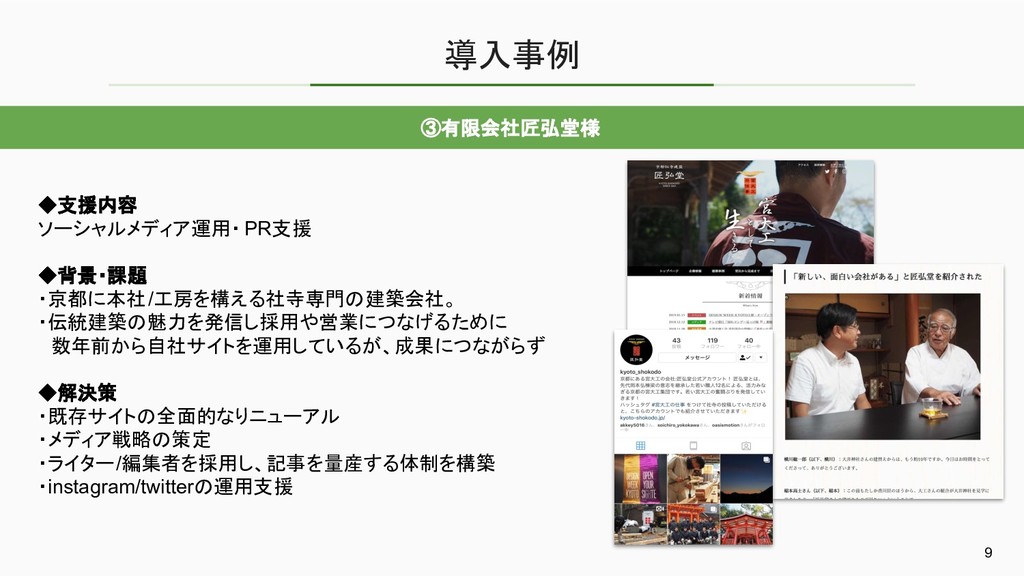導入事例 ③有限会社匠弘堂様 9 ◆支援内容 ソーシャルメディア運用・ PR支援 ◆背景・課題 ・京都に本社/工房を構える社寺専門の建築会社。 ・伝統建築の魅力を発信し採用や営業につなげるために 数年前から自社サイトを運用しているが、成果につながらず