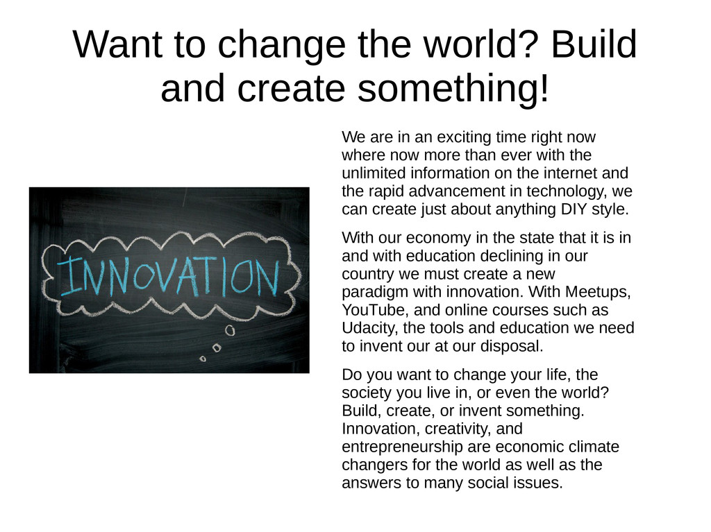 are in an exciting time right now where now more than ever with the unlimited information on the internet and the rapid advancement in technology, we can create just about anything DIY style. With our economy in the state that it is in and with education declining in our country we must create a new paradigm with innovation. With Meetups, YouTube, and online courses such as Udacity, the tools and education we need to invent our at our disposal. Do you want to change your life, the society you live in, or even the world? Build, create, or invent something. Innovation, creativity, and entrepreneurship are economic climate changers for the world as well as the answers to many social issues.