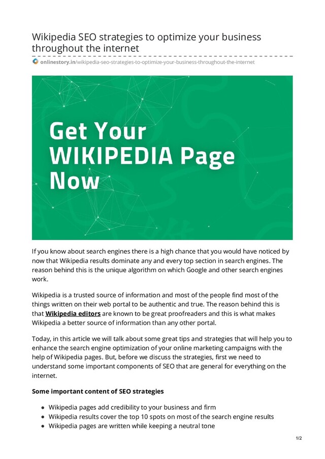 onlinestory.in/wikipedia-seo-strategies-to-optimize-your-business-throughout-the-internet If you know about search engines there is a high chance that you would have noticed by now that Wikipedia results dominate any and every top section in search engines. The reason behind this is the unique algorithm on which Google and other search engines work. Wikipedia is a trusted source of information and most of the people find most of the things written on their web portal to be authentic and true. The reason behind this is that Wikipedia editors are known to be great proofreaders and this is what makes Wikipedia a better source of information than any other portal. Today, in this article we will talk about some great tips and strategies that will help you to enhance the search engine optimization of your online marketing campaigns with the help of Wikipedia pages. But, before we discuss the strategies, first we need to understand some important components of SEO that are general for everything on the internet. Some important content of SEO strategies Wikipedia pages add credibility to your business and firm Wikipedia results cover the top 10 spots on most of the search engine results Wikipedia pages are written while keeping a neutral tone 1/2