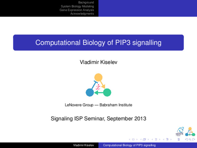 of PIP3 signalling Vladimir Kiselev LeNovere Group — Babraham Institute Signaling ISP Seminar, September 2013 Vladimir Kiselev Computational Biology of PIP3 signalling