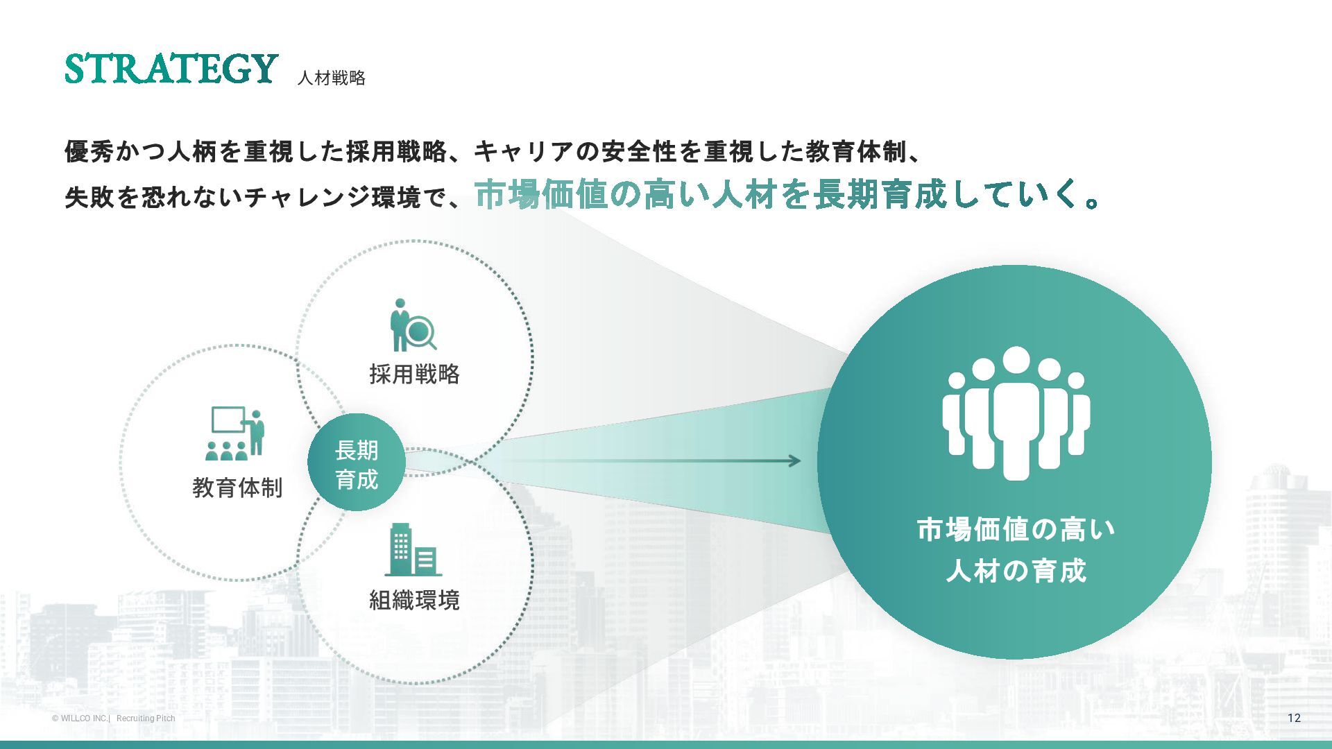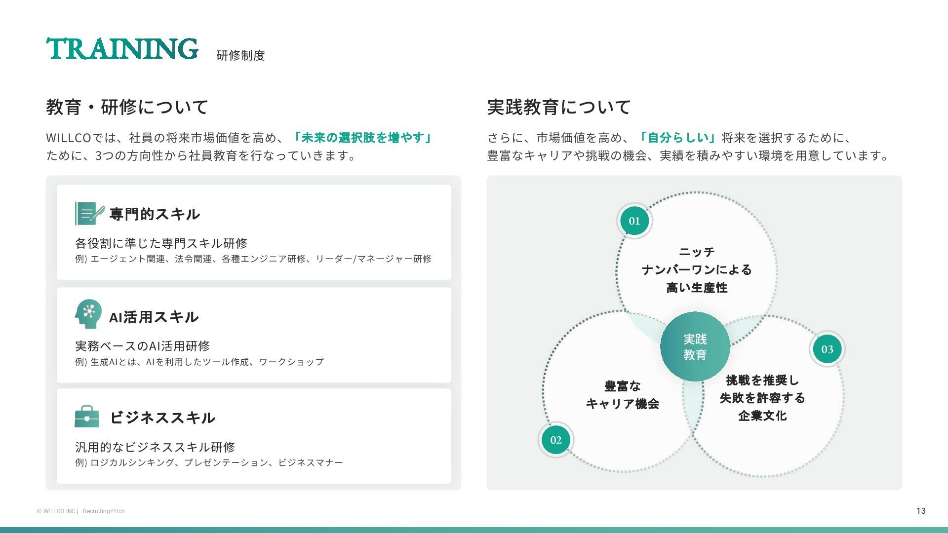 12 © WILLCO INC.| Recruiting Pitch ⼈材戦略 優秀かつ人柄を重視した採用戦略、キャリアの安全性を重視した教育体制、 失敗を恐れないチャレンジ環境で、 市場価値の高い