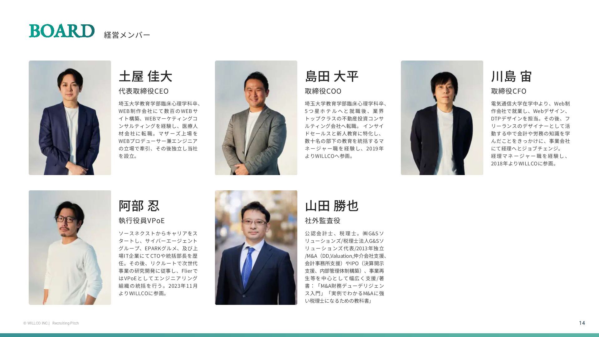 埼⽟⼤学教育学部臨床⼼理学科卒、 WEB制作会社にて数百のWEBサ イト構築、WEBマーケティングコ ンサルティングを経験し、医療⼈ 材会社に転職。マザーズ上場を WEBプロデューサー兼エンジニア の⽴場で牽引、その後独⽴し当社 を設⽴。 島⽥ ⼤平 取締役COO 埼⽟⼤学教育学部臨床⼼理学科卒、 5 つ 星 ホ テ ル へ と 就 職 後 、 業 界 トップクラスの不動産投資コンサ ルティング会社へ転職。 インサイ ドセールスと新⼈教育に特化し、 数⼗名の部下の教育を統括するマ ネージャー職を経験し、2019年 よりWILLCOへ参画。 川島 宙 取締役CFO 電気通信⼤学在学中より、Web制 作会社で就業し、Webデザイン、 DTPデザインを担当。その後、フ リーランスのデザイナーとして活 動する中で会計や労務の知識を学 んだことをきっかけに、事業会社 にて経理へとジョブチェンジ。 経理マネージャー職を経験し、 2018年よりWILLCOに参画。 阿部 忍 執⾏役員VPoE ソースネクストからキャリアをス タートし、サイバーエージェント グループ、EPARKグルメ、及び上 場IT企業にてCTOや統括部⻑を歴 任。その後、リクルートで次世代 事業の研究開発に従事し、Flierで はVPoEとしてエンジニアリング 組織の統括を⾏う。2023年11⽉ よりWILLCOに参画。 ⼭⽥ 勝也 社外監査役 公 認 会 計 ⼠ 、 税 理 ⼠ 。 ㈱ G&S ソ リューションズ/税理⼠法⼈G&Sソ リューションズ代表/2013年独⽴ /M&A(DD,Valuation,仲介会社⽀援、 会計事務所⽀援)やIPO(決算開⽰ ⽀援、内部管理体制構築)、事業再 ⽣等を中⼼として幅広く⽀援/著 書:「M&A財務デューデリジェン ス⼊⾨」「実例でわかるM&Aに強 い税理⼠になるための教科書」