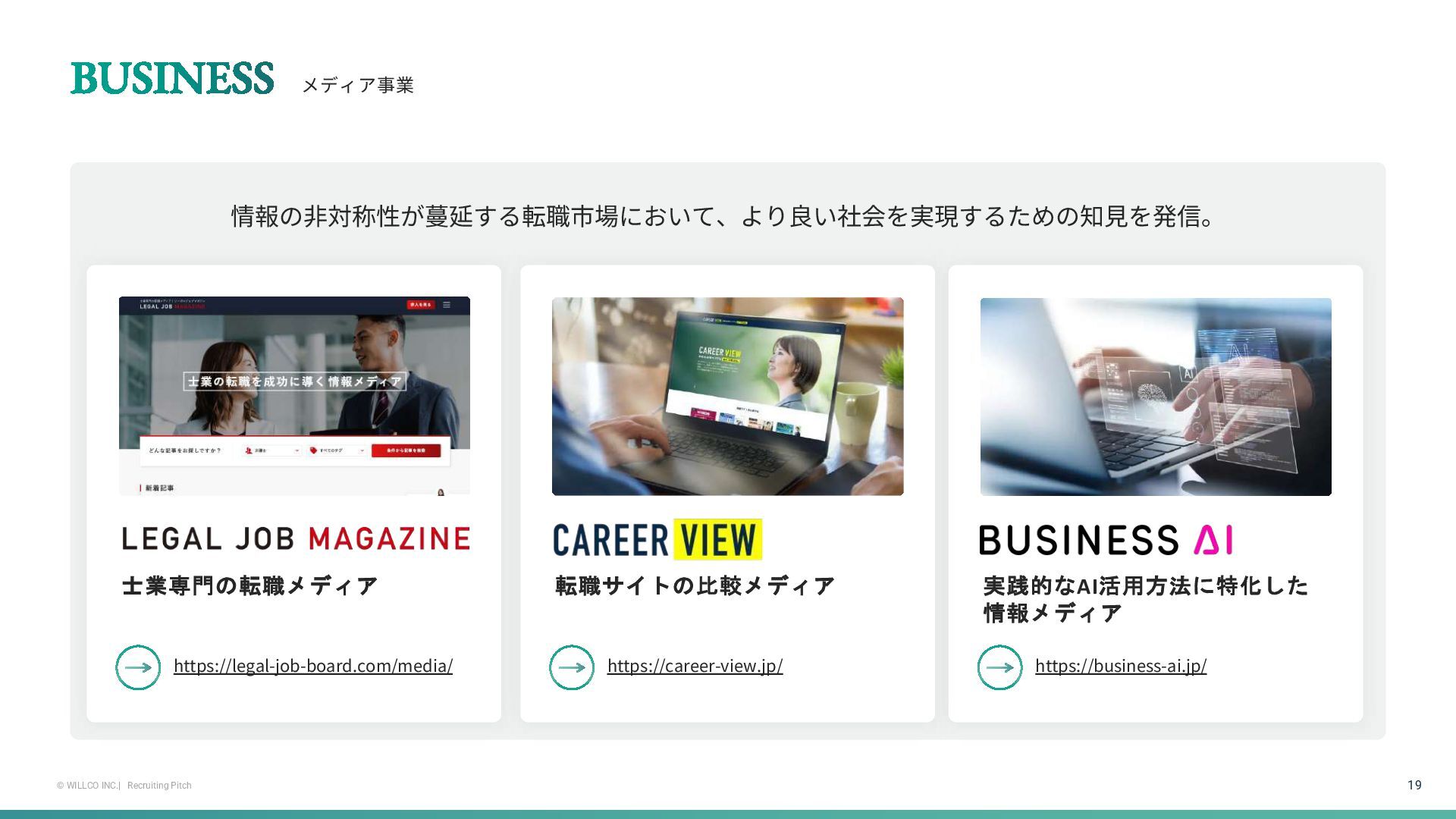 19 © WILLCO INC.| Recruiting Pitch 実践的なAI活用方法に特化した 情報メディア https://business-ai.jp/ 転職サイトの比較メディア